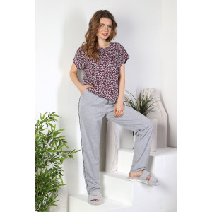Представляем Вашему вниманию женский костюм из трикотажного полотна «кулирка» в комбинации двух видов: с набивным рисунком и гладкокрашеного в единой цветовой гамме, состоящий из футболки и брюк. Футболка - из гладкокрашеного полотна, классического покроя, с короткими цельнокроеными рукавами, горловиной овальной формы, обработанной окантовкой из основного материала и принтом на полочке, выполненным в технике «шелкографии». Брюки - из полотна с набивным рисунком, свободного покроя, с карманами, узким кантом из отделочного материала в боковых швах, на притачном поясе с эластичной тесьмой внутри и шнурком, продетым через две петли в центре пояса.