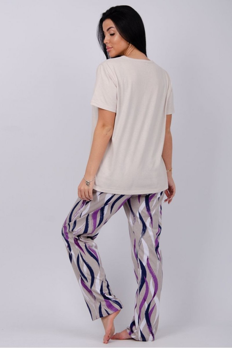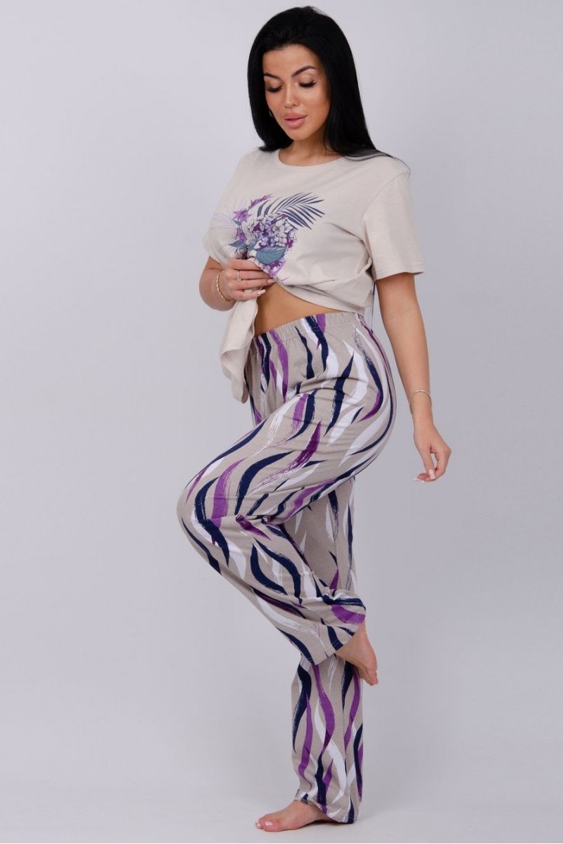 Представляем Вашему вниманию легкую женскую пижаму из кулирки - 100% натурального, дышащего хлопка. Комплект имеет элегантную расцветку, которая интересно смотрится и поднимает настроение. Изделие красиво сидит на фигуре и подчеркивает её достоинства. В ней Ваш сон будет максимально приятным и расслабляющим.