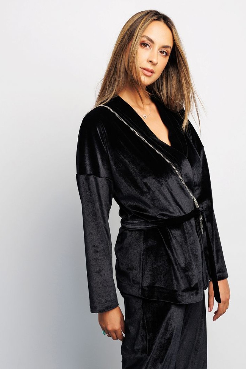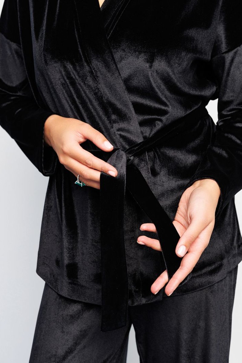 Представляем Вашему вниманию кардиган женский на запах с поясом – идеальное сочетание функциональности, стиля и роскоши. Выполненный из качественного велюра, он является нарядным вариантом для праздничного вечернего выхода, на Новый год или выпускной. Бархатная ворсистая фактура материала кофты подарит своей обладательнице ощущение комфорта, мягкости и уюта. Трикотажная блузка подчеркнет красивый силуэт и добавит образу изящность, женственность и сексуальность. Кардиган удлиненный в стиле олд мани стройнит и безупречно сядет на любую фигуру. Подойдет для беременных или для женщин больших размеров плюс сайз. Покрой на запах будет удобен для кормящих женщин и при этом позволит выглядеть им безупречно. Кардиган черный в комплекте с такими же брюками плюш создадут великолепный костюм в стиле гэтсби для фотосессии или тематической коктейльной вечеринки. Данная модель блузки на завязках будет уместна как часть делового образа в офис, для девочки или подростка. Вы не останетесь незамеченной в бархатном черном струящемся кардигане ретро и будете ловить восхищённые взгляды окружающих! Он станет незаменимым элементом Вашего гардероба, на любом торжестве Вы будете выглядеть дорого и благородно. Позвольте себе это роскошное нарядное кимоно женское с завязками на талии!