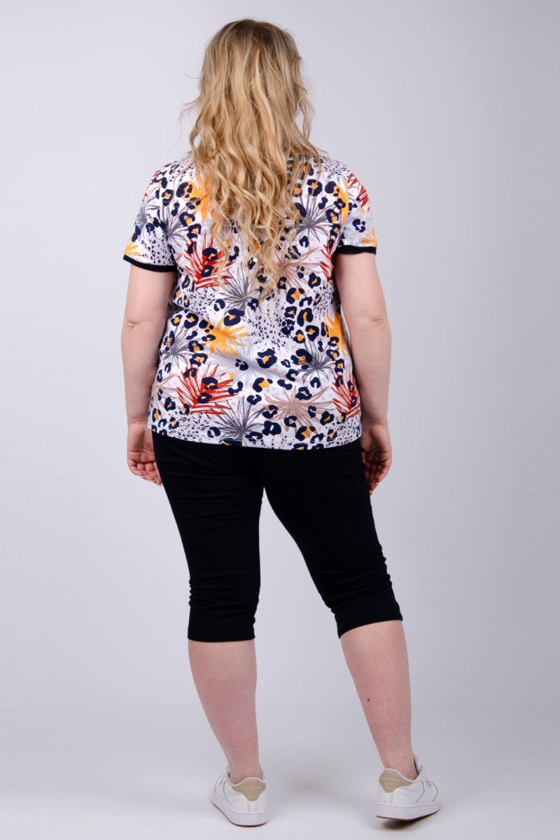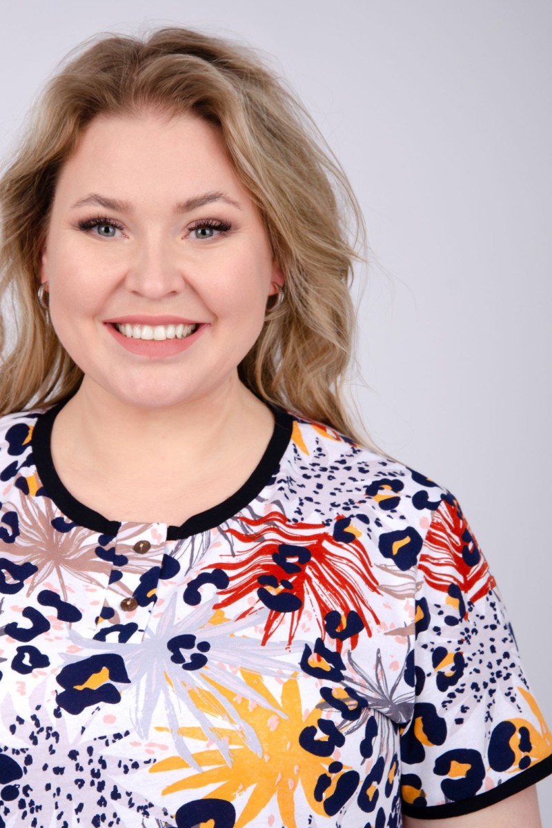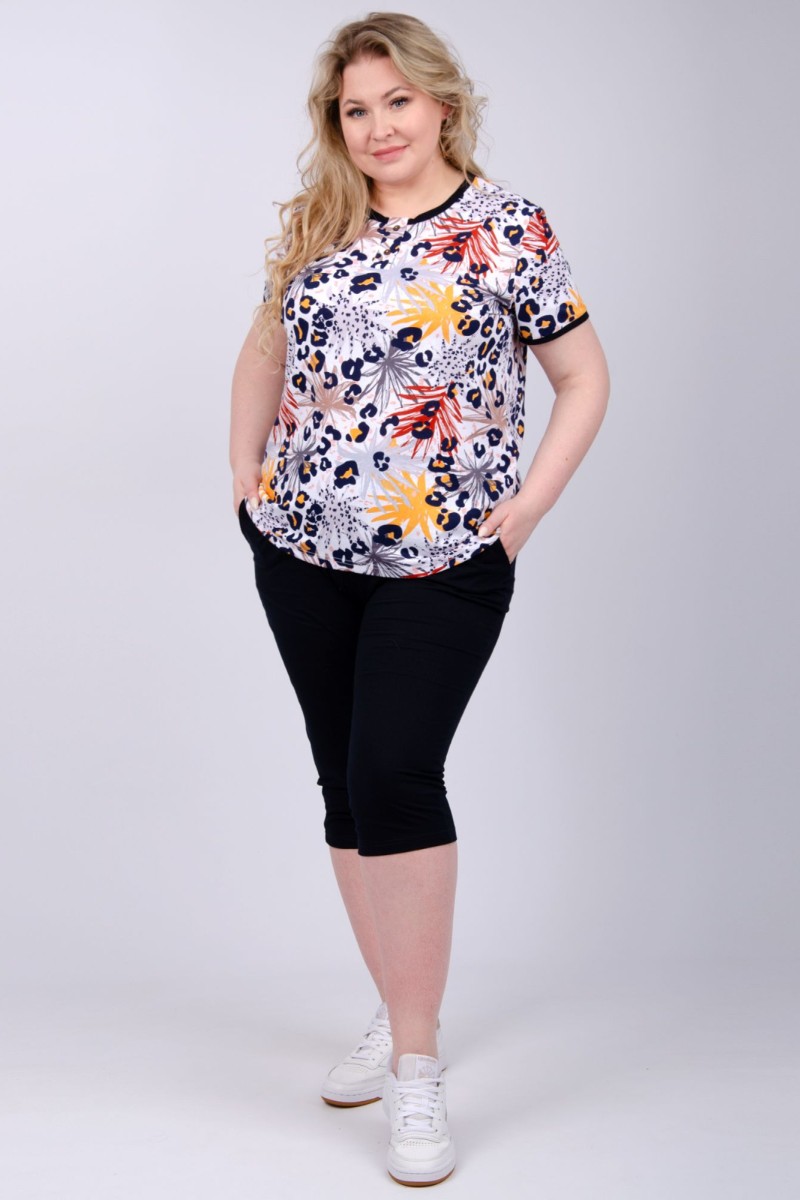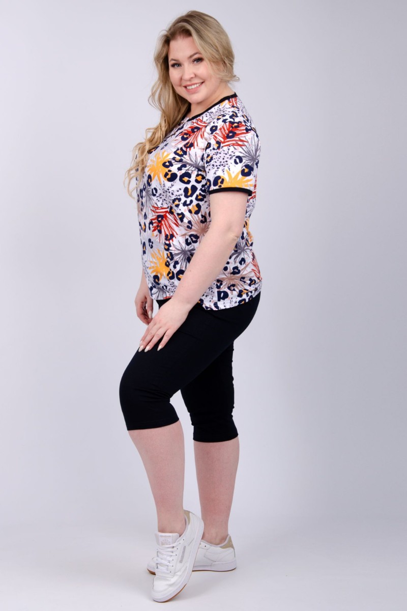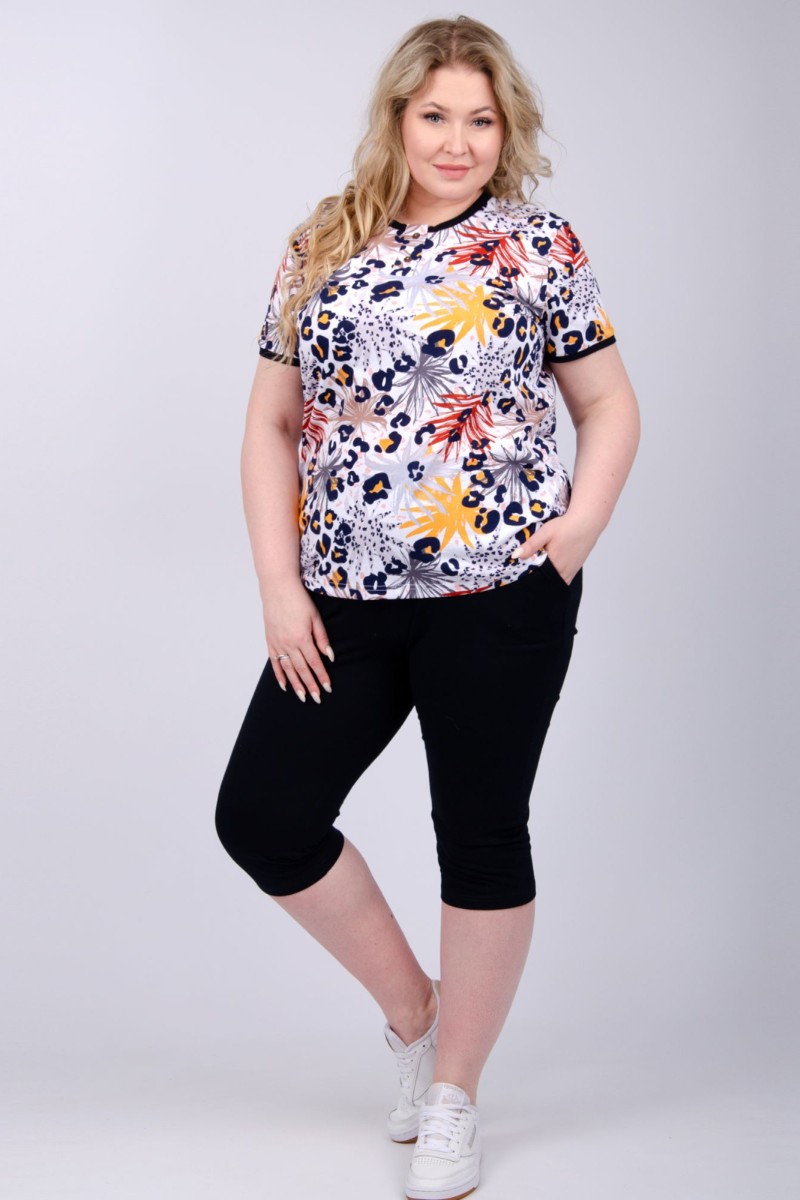Представляем Вашему вниманию легкий женский костюм двойку из кулирки - 100% натурального, дышащего хлопка. Комплект имеет интересную расцветку, которая красиво смотрится и поднимает настроение. Костюм хорошо сидит на фигуре и подчеркивает её достоинства. В нём Вы будете чувствовать себя комфортно и уверенно.