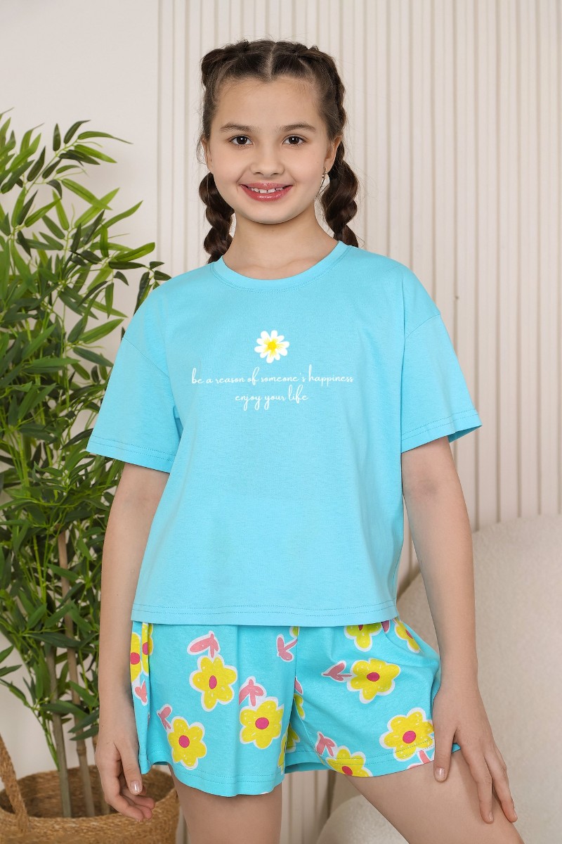 Представляем Вашему вниманию костюм для девочки, состоящий из футболки и шорт. Футболка - из гладкокрашеного трикотажного полотна "кулирка" с короткими втачными рукавами, горловиной овальной формы, обработанной втачной планкой и принтом в центре переда, выполненным в технике шелкографии. Шорты - из трикотажного полотна "кулирка" с набивным цветочным рисунком, классического покроя, с эластичной тесьмой по талии.