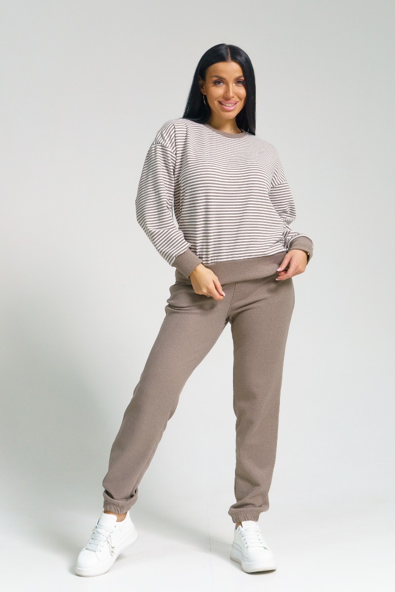 Представляем Вашему вниманию стильный костюм, состоящий из брюк и джемпера. Брюки с карманами, низ брюк на резинке. Срезы костюма отделаны рибаной в цвет.