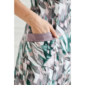 Представляем Вашему вниманию халат классической модели на молнии, длины за колено, для придания силуэта есть завязки, 2 кармана, рукава-крылышки с двойной оборкой, карманы и волан по низу изделия - отделаны тканью компаньоном.