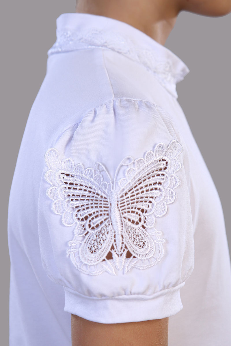 Представляем Вашему вниманию нежную трикотажную блузу. Стильная детская блузка с кружевом украшена нежными аппликациями с бабочками на рукавах. Это придает оригинальный стиль этой блузке. Нежные рукава-фонарики и кружевной воротник-стойка создают легкий и воздушный образ. Водолазка идеальна как повседневная школьная форма для детей.