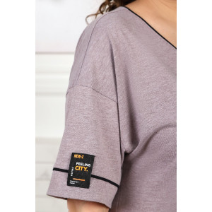 Представляем Вашему вниманию халат женский из гладкокрашеного трикотажного полотна «кулирка меланж», прямого силуэта, со спущенным плечом, короткими втачными рукавами, горловиной V-образной формы, карманами в боковых швах, центральной бортовой застежкой на тесьму «молния» и принтом на полочке, выполненным методом «шелкографии». Нижние срезы рукавов с притачными манжетами и кантом, на рукаве декоративная нашивка. Горловина обработана узким притачным кантом контрастного цвета.