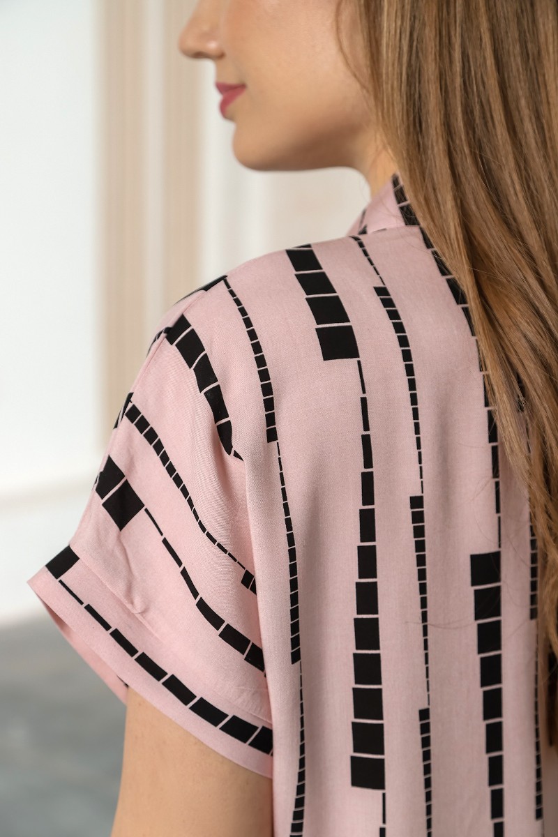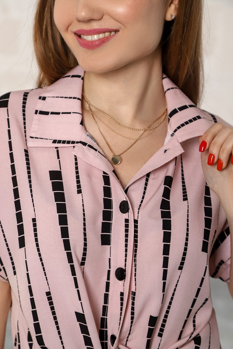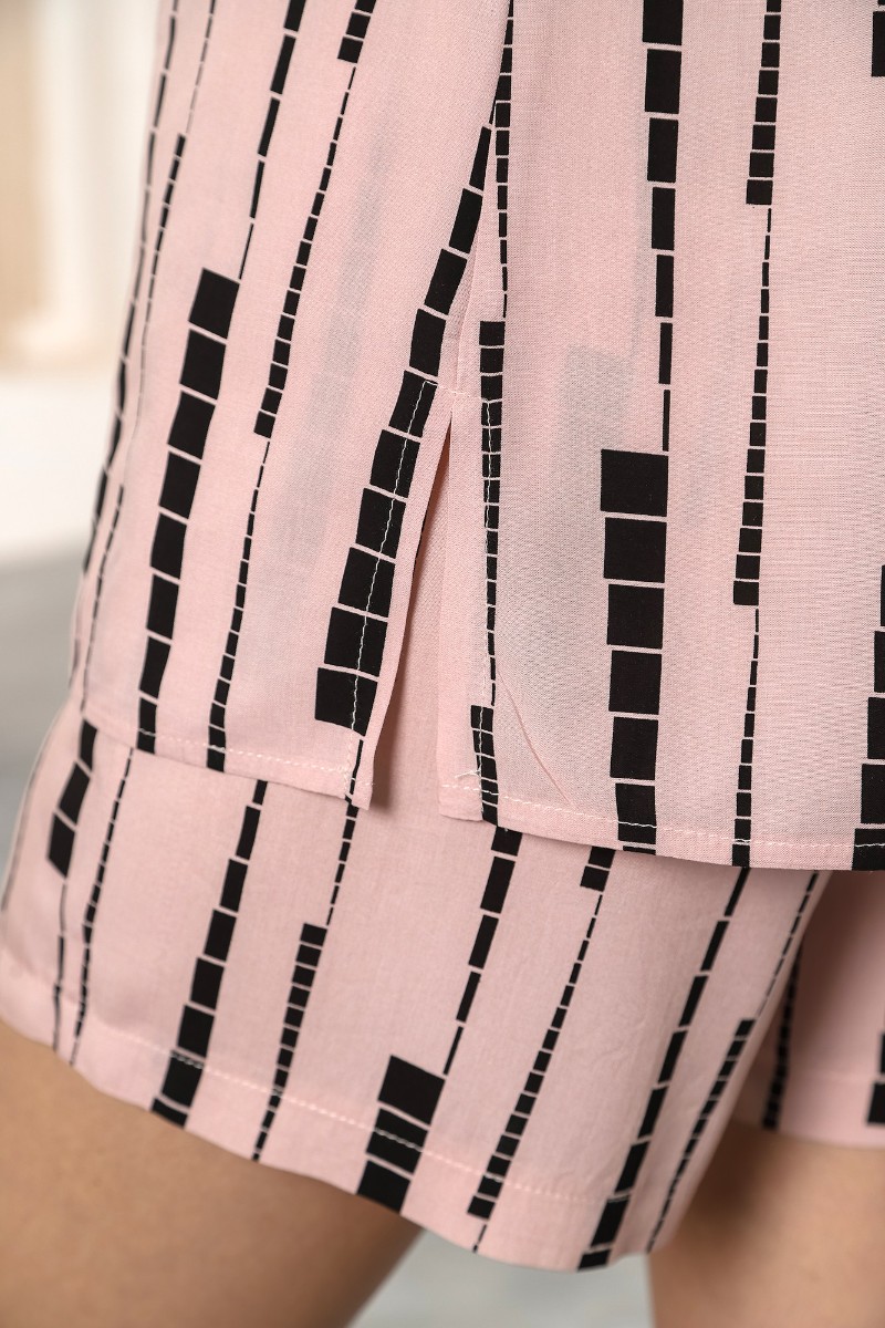 Представляем Вашему вниманию костюм молодежный из тканого штапельного полотна набивным рисунком, состоящий из рубашки и шорт. Рубашка – свободного покроя, с короткими цельнокроеными рукавами на притачных манжетах, стояче-отложным воротником, центральной бортовой застежкой на петли и пуговицы и разрезами в боковых швах. Шорты – свободного покроя, средней длины, на притачном поясе с эластичной тесьмой внутри и карманами в боковых швах.