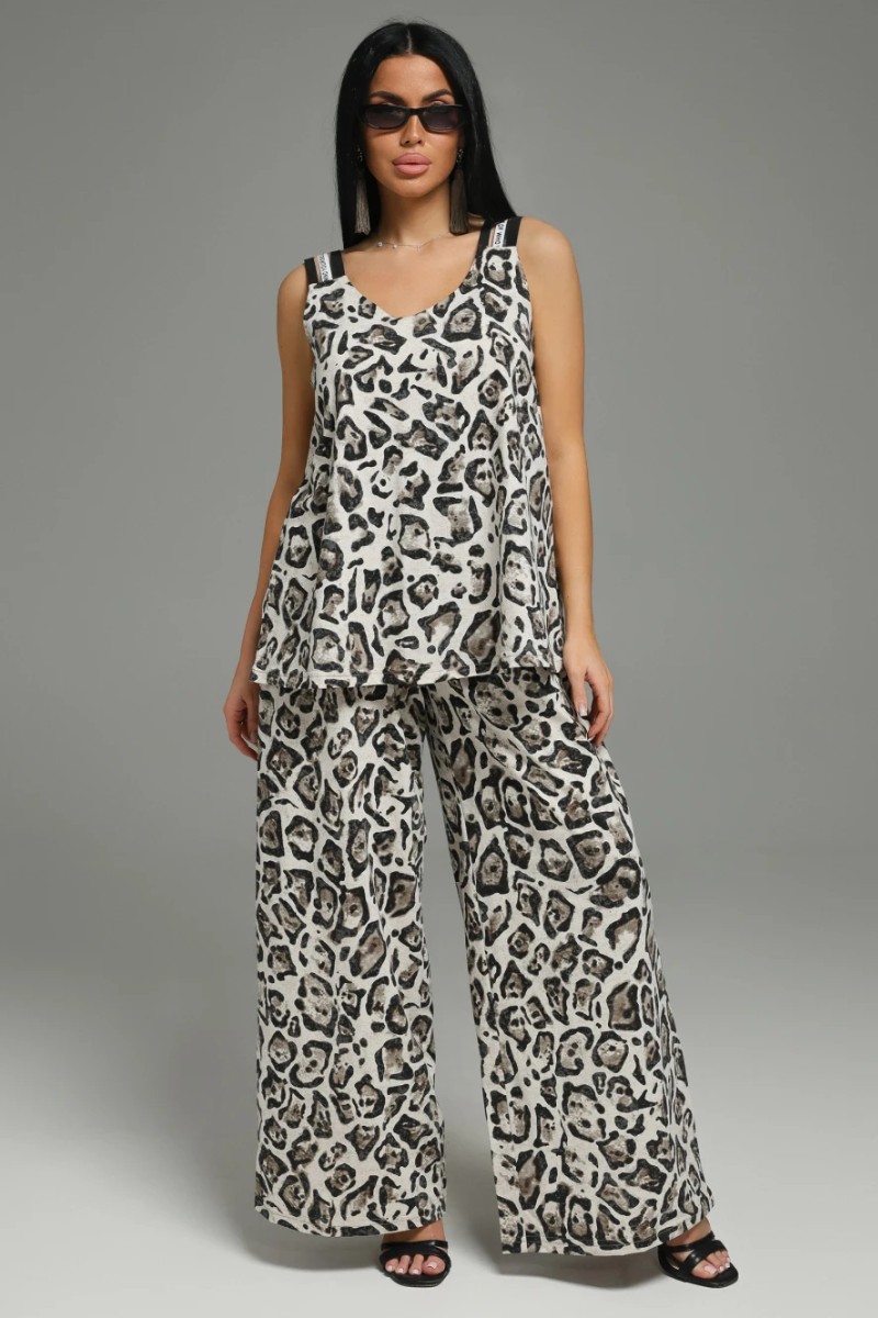 Представляем Вашему вниманию легкий женский костюм двойку, который состоит из топа и брюк. Вырез горловины топа на полочке и спинке V- образный. Лямки топа выполнены из декоративной резинки. Брюки прямые от бедра с отрезным поясом.