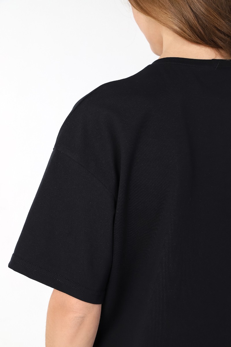 Представляем Вашему вниманию футболку молодежную из гладкокрашеного трикотажного полотна «кулирка с лайкрой», свободного покроя, с втачными короткими рукавами и вышивкой пайетками на полочке. Горловина овальной формы обработана втачной планкой с отделочной строчкой по шву притачивания.