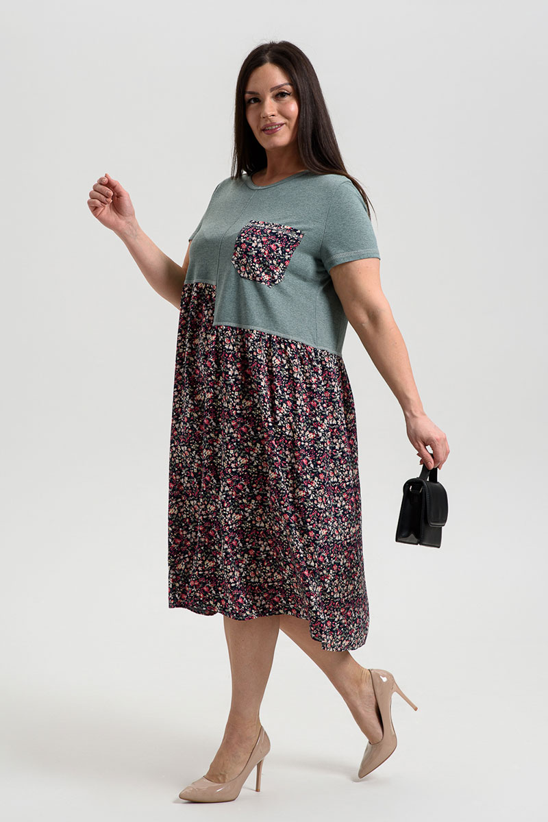 Представляем Вашему вниманию платье женское полуприлегающего силуэта. Горловина округлая, рукав втачной короткий. Верхняя часть полочки и спинки, рукав из кулирки. Нижняя часть платья из штапеля в мелкий цветочек. Верхняя правая и верхняя левая части полочки заканчиваются на разных уровнях, на левой полочке нагрудный карман из штапеля. Нижняя часть платья слегка собрана, что дает более свободный объем по бедрам. В боковых швах внутренние карманы.