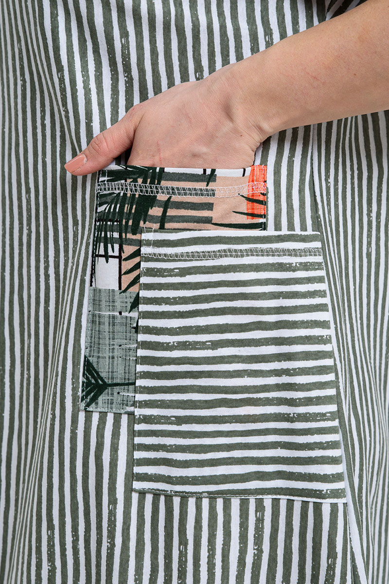 Представляем Вашему вниманию платье женское полуприлегающего силуэта, слегка расширенное к низу. Кокетка полочки переходит в короткий цельнокроенный рукав, по шву притачивания кокетки к полочке кокетка присборена. Нижняя часть платья из отделочной ткани, сбоку разрезы. На полочке с каждой стороны по два накладных кармана, наложенных и смещенных друг относительно друга из основной ткани и ткани - компаньона. Все карманы функциональны. Свободный покрой и сочетание полосы с отделочной тканью придают платью достаточную комфортность и актуальность.