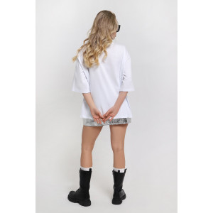 Представляем Вашему вниманию женскую футболку из гладкокрашеного свободного покроя оверсайз, с короткими втачными рукавами, спущенной линией плеча, горловиной овальной формы, обработанной широкой втачной планкой, и принтом на полочке, выполненным в технике «шелкографии».