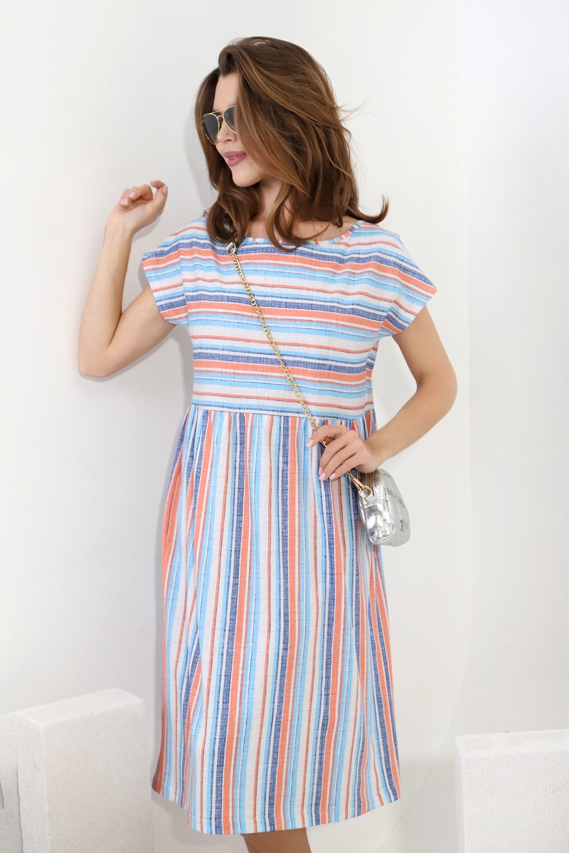 Представляем Вашему вниманию платье молодежное из полотна «кулирка» в полоску, отрезное по линии талии, с широкой юбкой на сборке, короткими цельнокроеными рукавами, горловиной овальной формы, окантованной основным материалом, с карманами в боковых швах.
