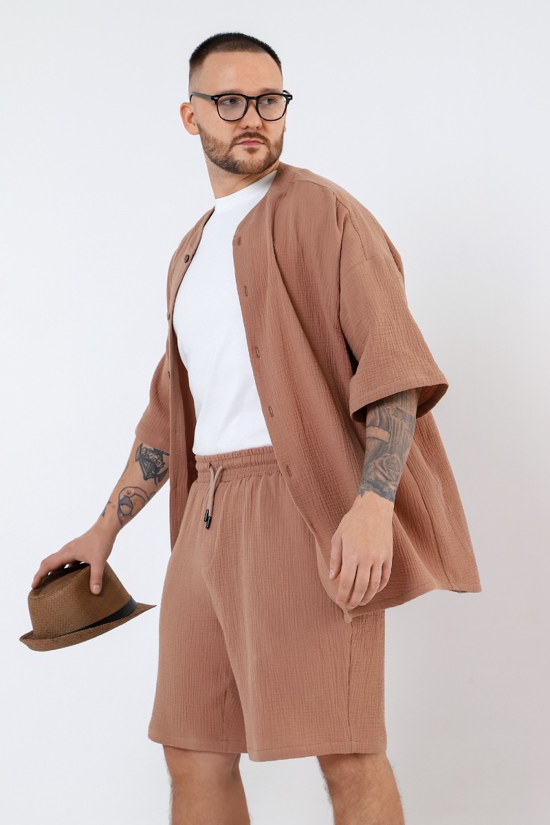 Представляем Вашему вниманию костюм мужской, свободный, из фактурного трикотажа, состоящий из сорочки и шорт. Сорочка на пуговицах, со спущенной линией плеч, плосколежащим воротником, переведенными к переду плечевыми швами, кокеткой на спинке, со складкой в шве притачивания, с рукавами длиной до локтя и фигурной линией низа. Шорты с боковыми карманами, на притачном поясе с эластичной тесьмой внутри. Пояс - с двумя обметанными петлями по центру, через которые вдет шнурок контрастного цвета для регулирования степени прилегания изделия по талии.