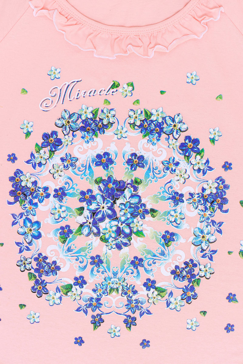 Представляем Вашему вниманию уютную и удобную женскую пижаму с симпатичной рюшей по горловине. Очень свободный и удобный крой. Рукав-реглан не стесняет движение рук. Обработка рукава и низа изделия в виде лёгкой волны придаёт лёгкость и воздушность. Шикарный принт в виде орнамента из россыпи цветов.