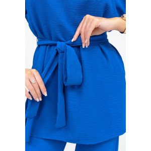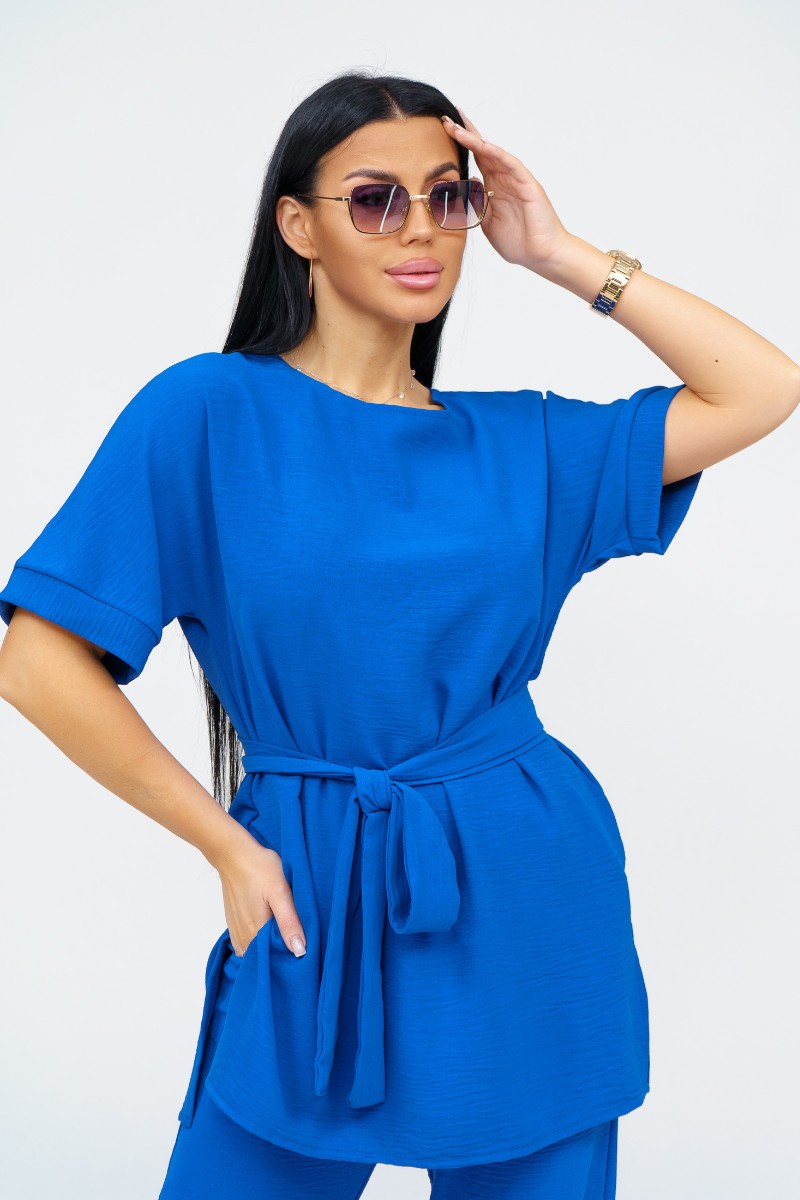 Представляем Вашему вниманию легкий костюм из жатки, состоящий из брюк и туники со спущенным плечом. Брюки с карманами и отстроченным поясом. В боковых швах туники разрезы, срезы рукавов обработаны манжетами. В комплекте пояс.