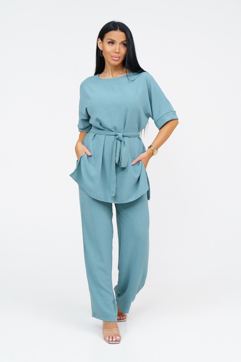 Представляем Вашему вниманию легкий костюм из жатки, состоящий из брюк и туники со спущенным плечом. Брюки с карманами и отстроченным поясом. В боковых швах туники разрезы, срезы рукавов обработаны манжетами. В комплекте пояс.