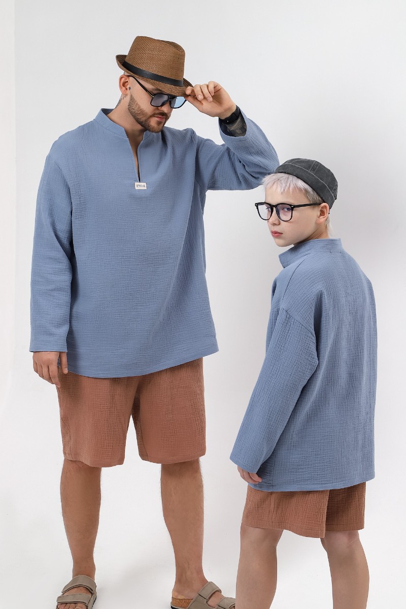 Представляем Вашему вниманию рубашку для мальчика из гладкокрашеного тканого полотна "муслин" свободного покроя, со спущенным плечом и рукавами 3/4 длины, с воротником-стойкой, с разрезом v-образной формы , выходящим из горловины и декоративным элементом прямоугольной формы, настроченным ниже разреза. Нижние срезы изделия и рукавов обработаны подгибкой.