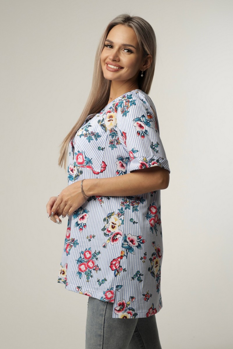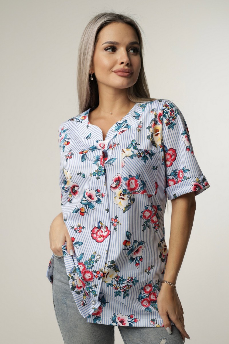 Представляем Вашему вниманию изящную женскую блузку из кулирки - 100% натурального, дышащего хлопка. Модель имеет элегантную расцветку, которая интересно смотрится и поднимает настроение. Изделие красиво сидит на фигуре и подчеркивает её достоинства. В ней Вы будете чувствовать себя комфортно и уверенно.