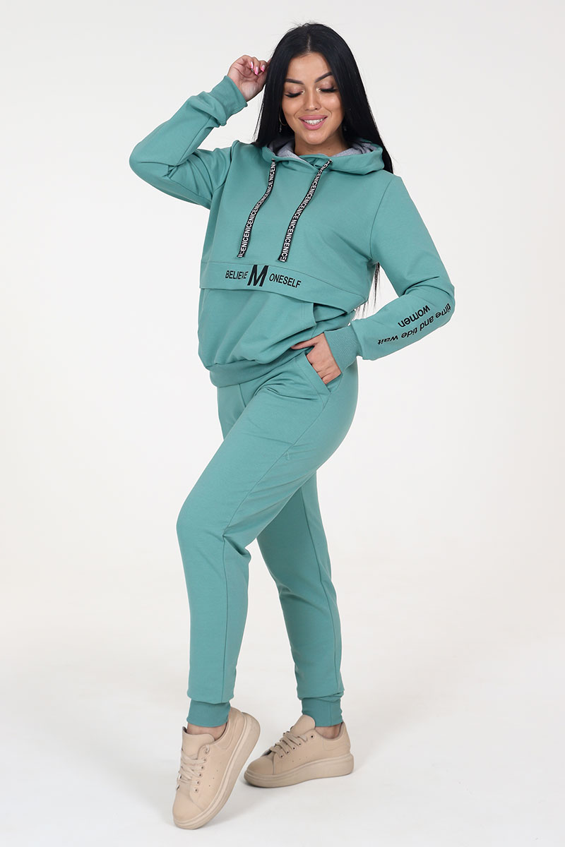 Представляем Вашему вниманию женский костюм из футера: состоит из удобных джоггеров и худи (толстовка) с капюшоном. Костюм выглядит очень стильно благодаря нанесенному печатному принту на толстовке-худи. Брюки - джоггеры в меру заужены. Пояс на резинке, манжеты рукавов и низ брюк сшиты из мягкого и эластичного кашкорсе. Низ толстовки тоже из кашкорсе, поэтому прекрасно садится по любой фигуре и выглядит эстетично, скрывая недостатки. Карман-кенгуру со входом с 2-х сторон. Двухсторонний капюшон изнутри отделан трикотажем - кулиркой, что отличает наш костюм от многих других и выглядит очень аккуратно. Футерный костюм идеален для прогулок, занятий спортом, для активного отдыха, поездок на природу.