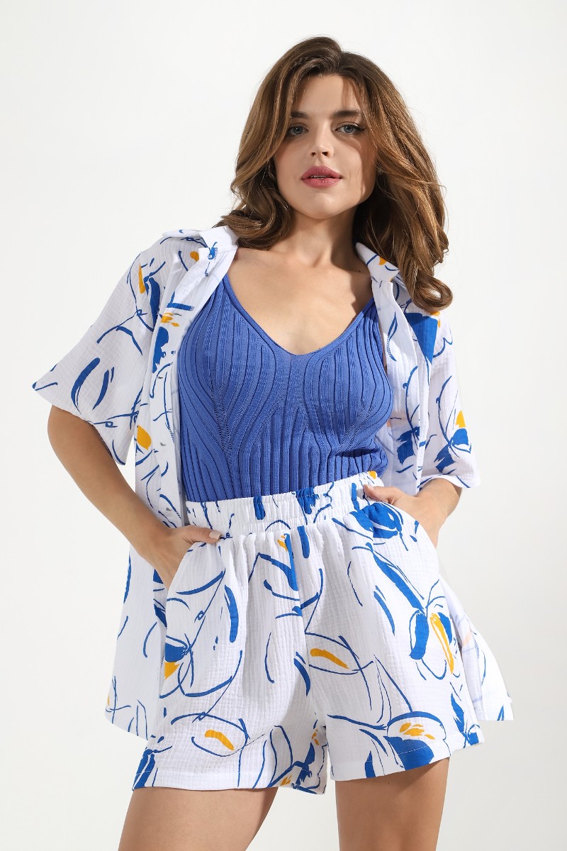 Представляем Вашему вниманию костюм молодежный из тканого полотна «муслин» с набивным рисунком, состоящий из Блуза (рубашка) свободного покроя, с короткими втачными рукавами, стояче- отложным воротником, центральной бортовой застежкой на обметанные петли и пуговицы, фигурной линией низа.Шорты свободные слегка расширенные книзу, с карманами в боковых швах на притачном поясе с эластичной тесьмой внутри. Топ в комплект не входит.