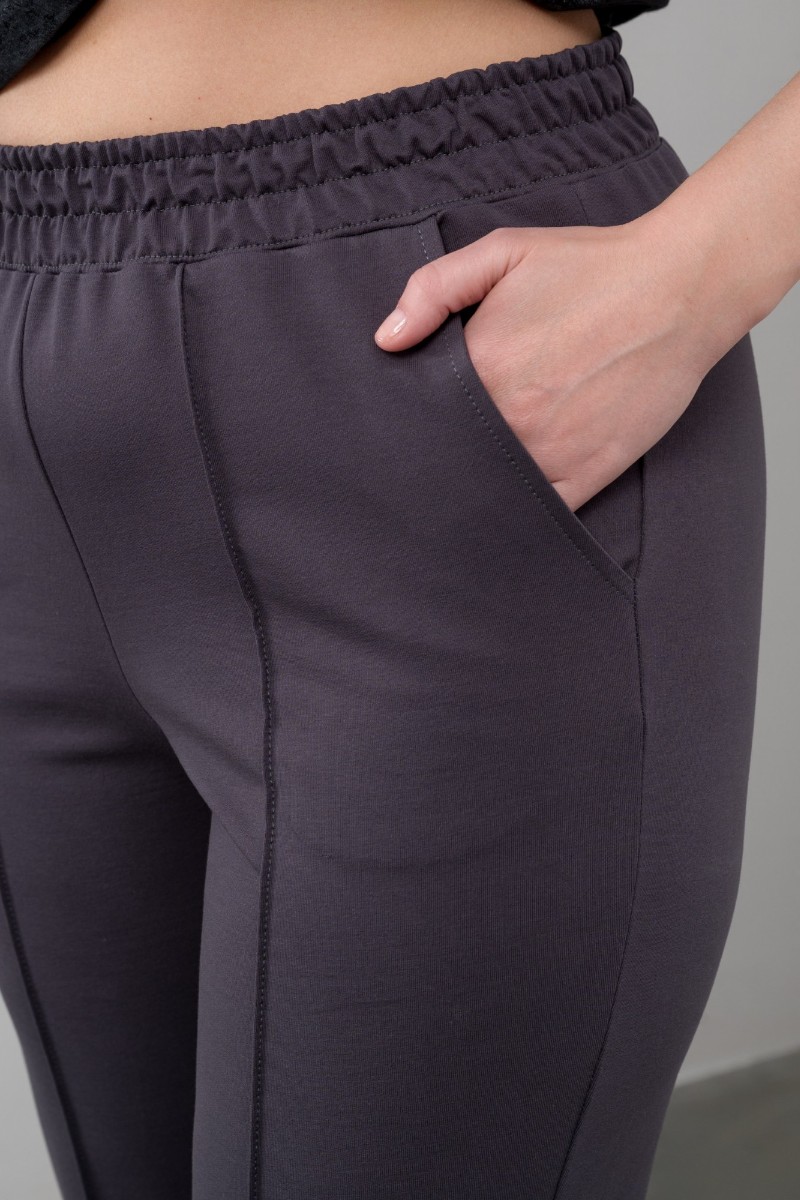 Представляем Вашему вниманию брюки женские из трикотажного полотна «футер-двунитка», длинные, полуприлегающего силуэта, на притачном поясе с эластичной тесьмой внутри и карманами в боковых швах. Передние половины застрочены по центральным линиям, на задних половинах обработаны две вытачки в области талии.