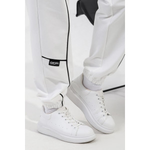 Представляем Вашему вниманию брюки молодежные из трикотажного полотна «футер двунитка» с лайкрой, длинные, на притачном поясе с эластичной тесьмой внутри и шнурком, продетым через две петли в центре пояса, с карманами в боковых швах и эластичной тесьмой по низу. Правая половина брюк – из трех частей, левая - из двух частей фигурной формы, с кантом контрастного цвета в соединительных швах. На правой половине по горизонтальному шву настрочен декоративный элемент.