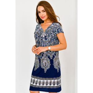 Представляем Вашему вниманию очаровательное женское платье, изготовленное из качественного материала. Платье прямого силуэта, длиной до линии колена. Рукав - втачной, короткий. По переду, в области груди ассиметричная драпировка, которая собрана на металлическое кольцо-подкову. Платье отлично сидит на фигуре и подарит Вам еще больше уверенности в себе и собственной привлекательности.
