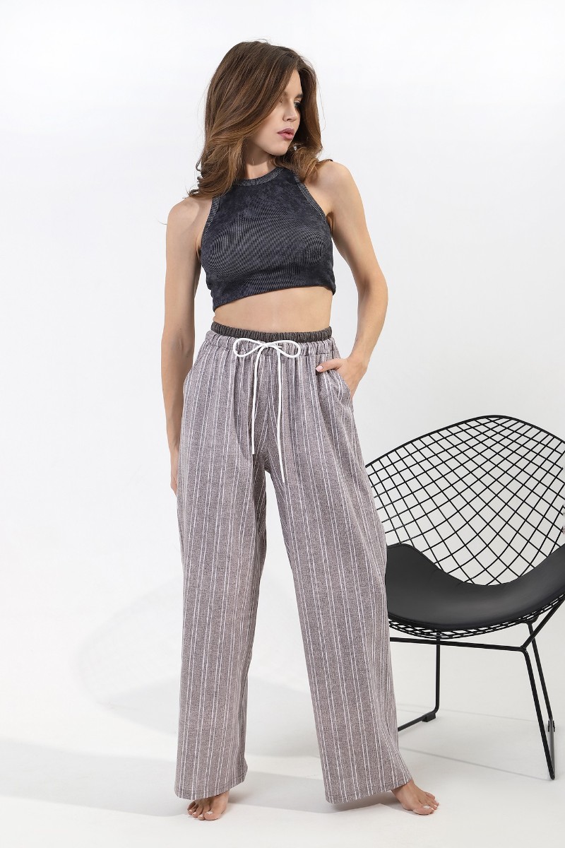 Представляем Вашему вниманию молодежные брюки из трикотажного полотна «кулирка» с набивным рисунком «полоска», длинные, свободные, на притачном поясе с эластичной тесьмой внутри, выполненным из двух видов ткани: с набивным рисунком и гладкокрашеной. В пояс вставлен декоративный шнурок, продетый через две обметанные петли в центре пояса.