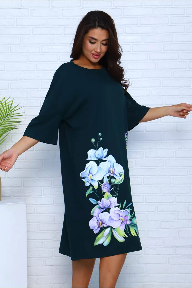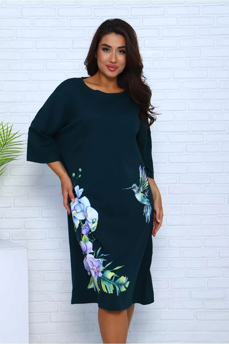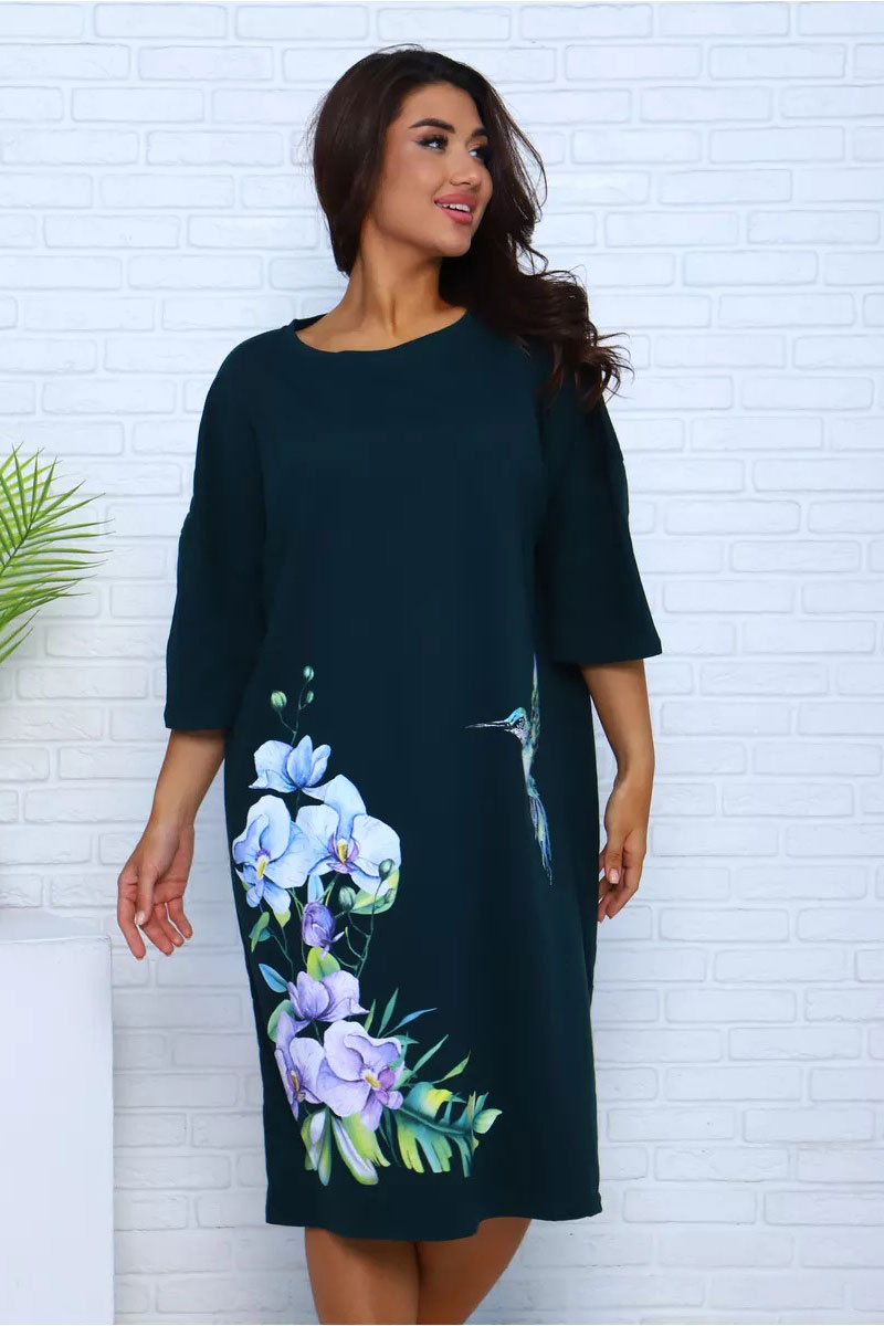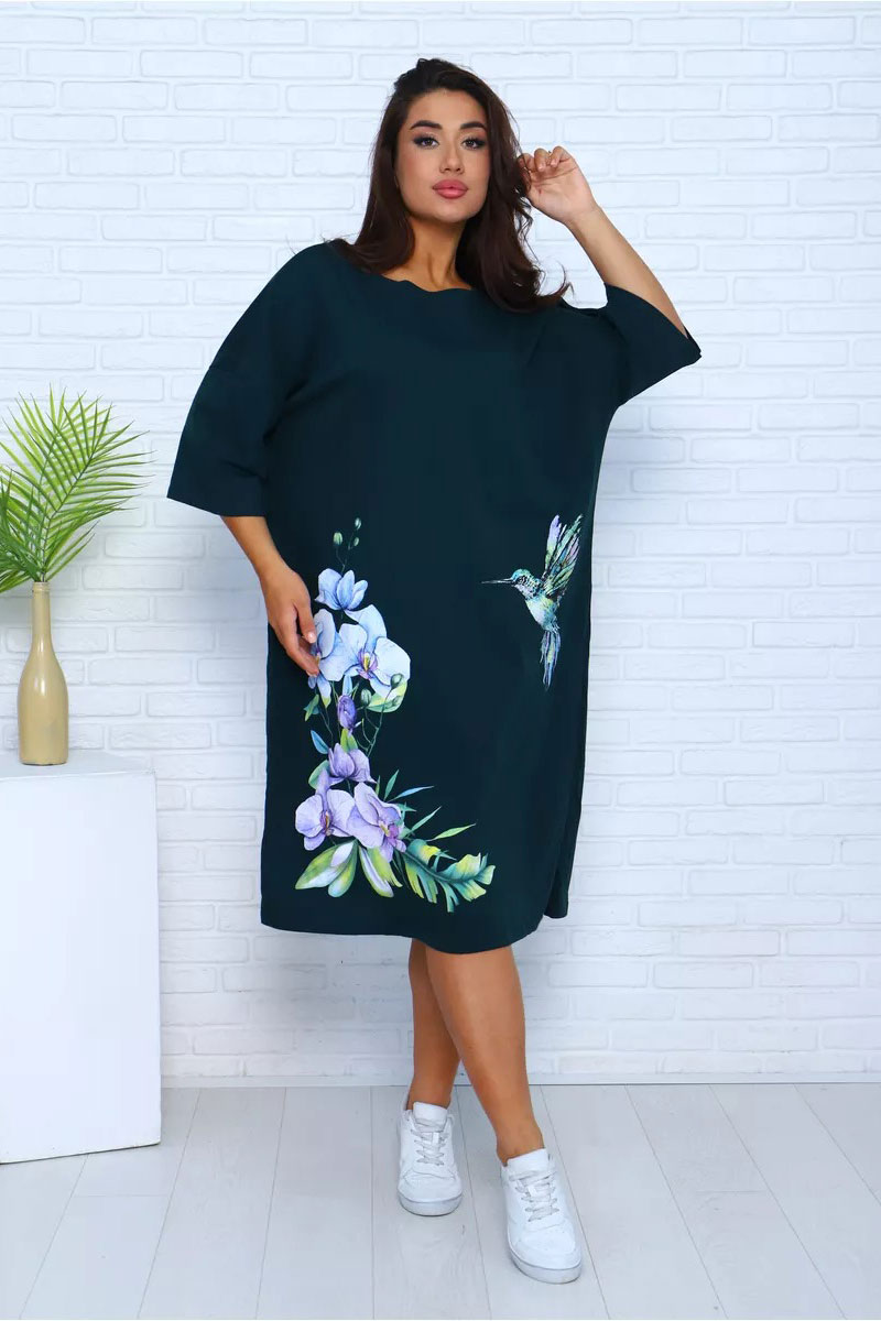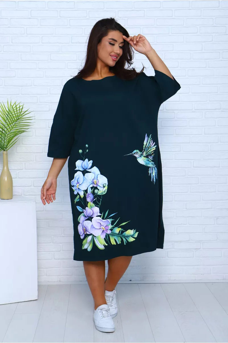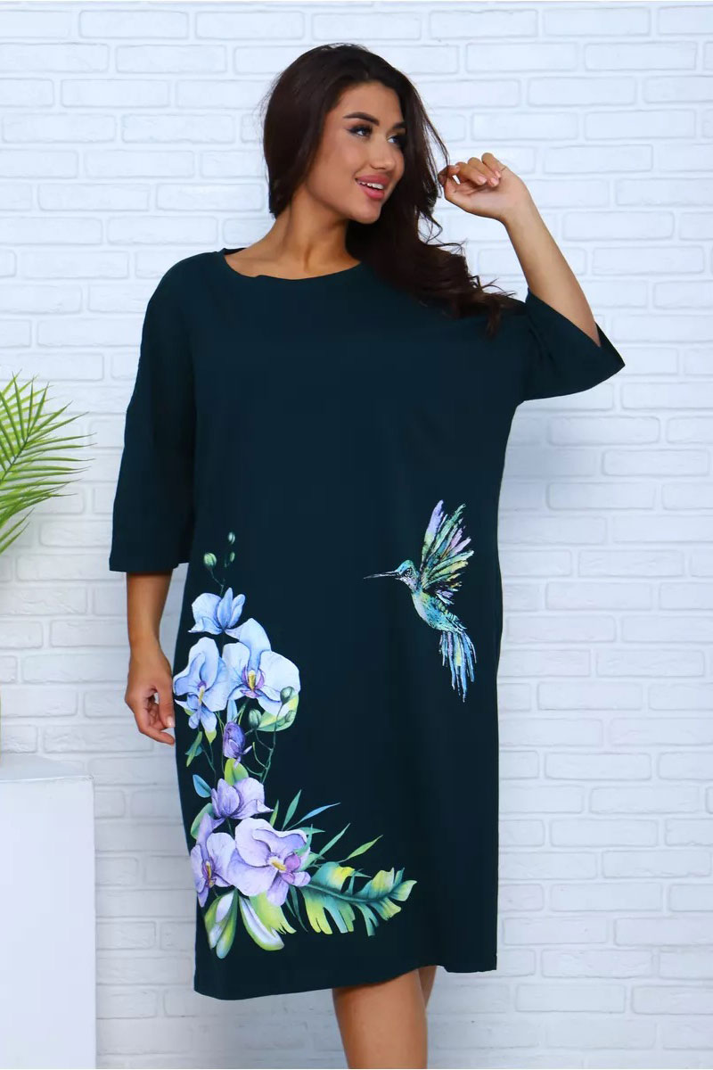 Представляем Вашему вниманию платье-футболку для дома из 100% хлопка. Наши туники, выполненные из мягкой и дышащей ткани, напоминают удлиненные футболки свободного кроя. Они идеально подходят для домашнего уюта. Крупный рисунок с цветами и яркой колибри останется ярким и насыщенным даже после множества стирок и не выгорит на солнце. Черное платье особенно эффектно, а узор на нем выглядит особенно живо и ярко. На средний рост длина платья будет до колена, а на высоких девушках — чуть короче.