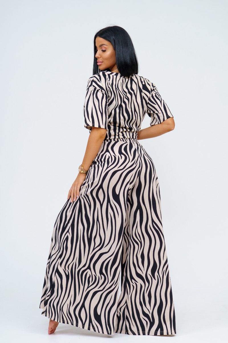 Представляем Вашему вниманию стильный женский комплект, состоящий из широких брюк-палаццо и футболки со спущенными плечами. Пояс брюк отстрочен на спецмашине. Срезы футболки подшиты на плоскошовке.