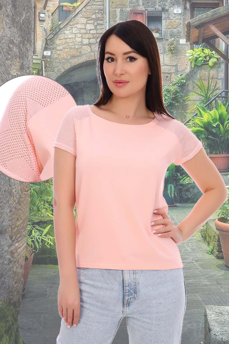 Представляем Вашему вниманию женскую футболку выполненую из качественного материала. Футболка свободного покроя из комбинированного трикотажного полотна. Спущенная пройма, реглан из ажурного трикотажа, вырез горловины в виде "лодочки", низ спинки слегка удлинён и закруглён.