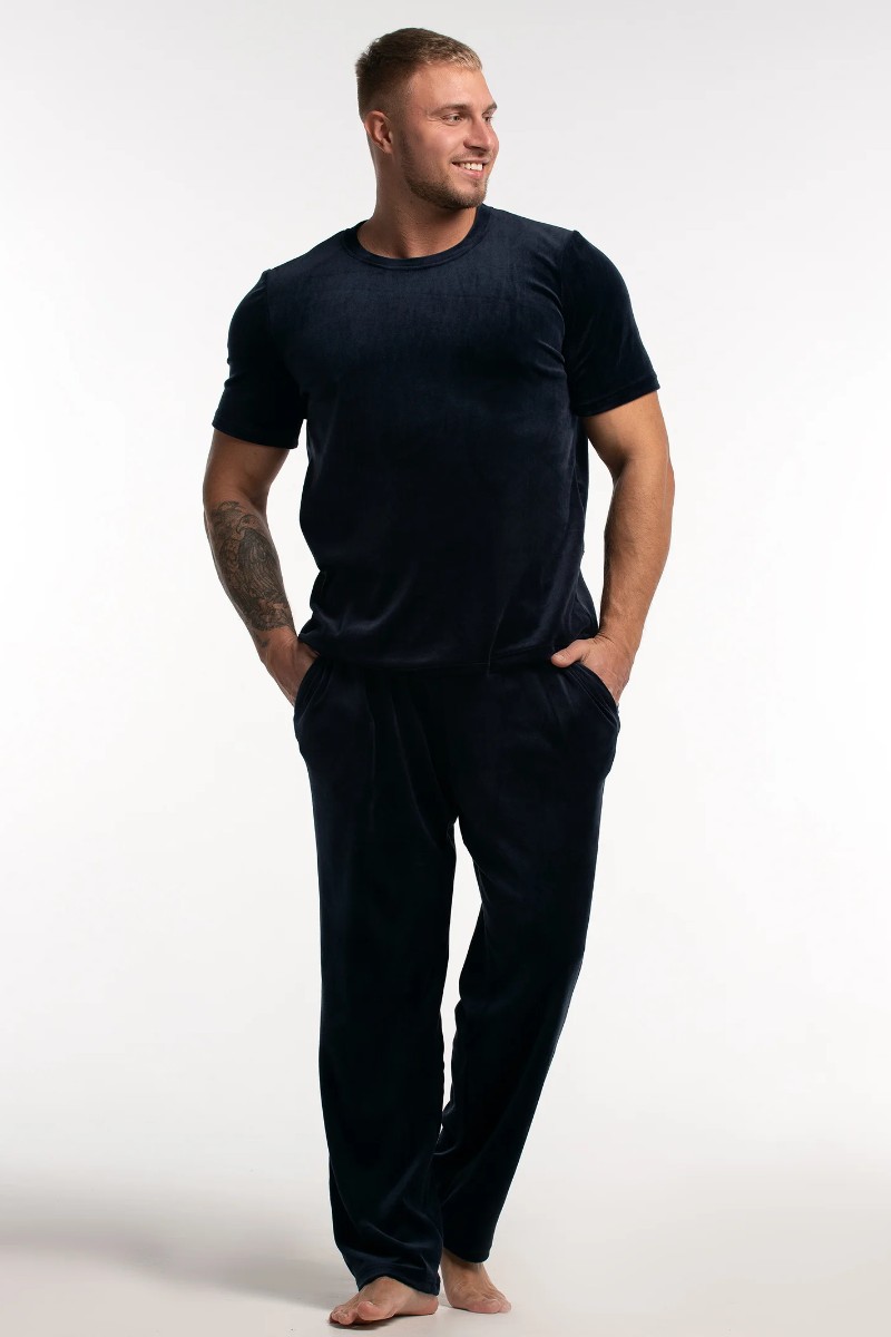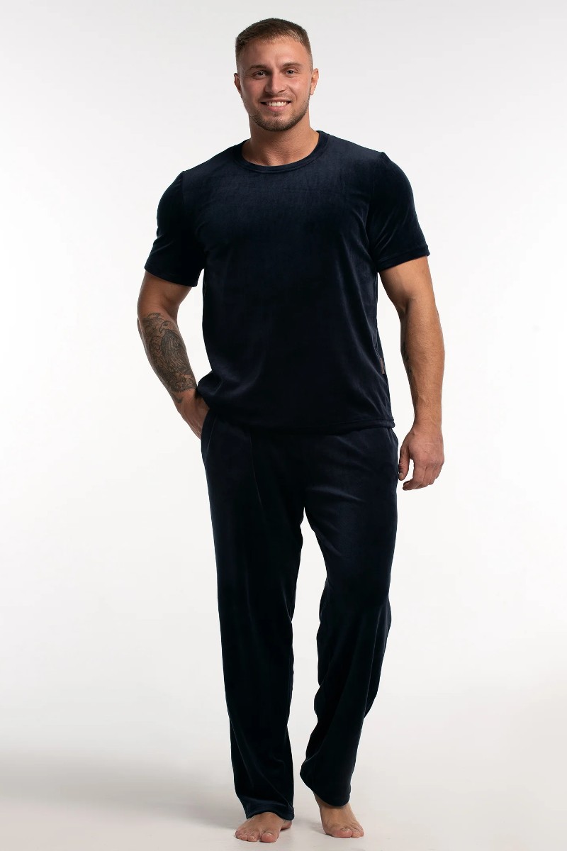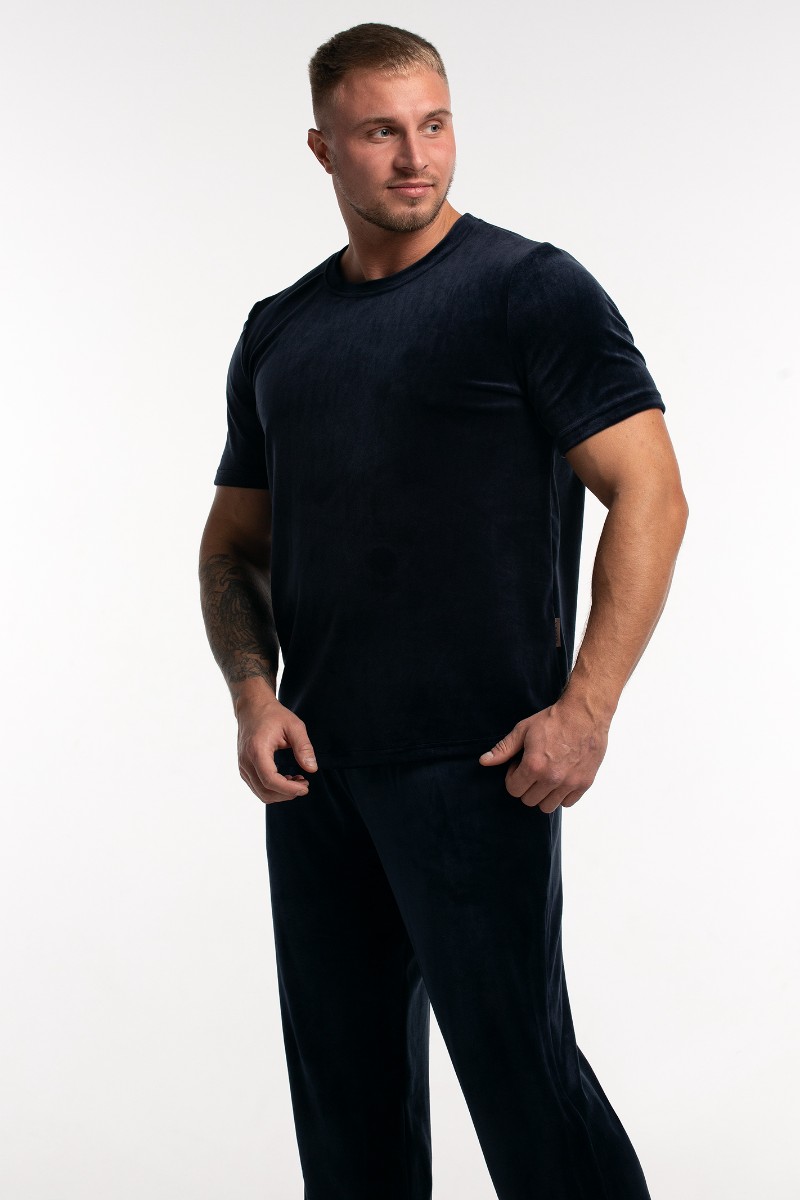 Представляем Вашему вниманию домашний мужской костюм из велюра - это прекрасный выбор для тех, кто ценит комфорт и уют. Комплект состоит из мягкой футболки и удобных брюк, выполненных из высококачественного велюрового материала. Мужская футболка имеет классический крой, короткие рукава и круглый вырез. Брюки прямого покроя с эластичным поясом и карманами по бокам.