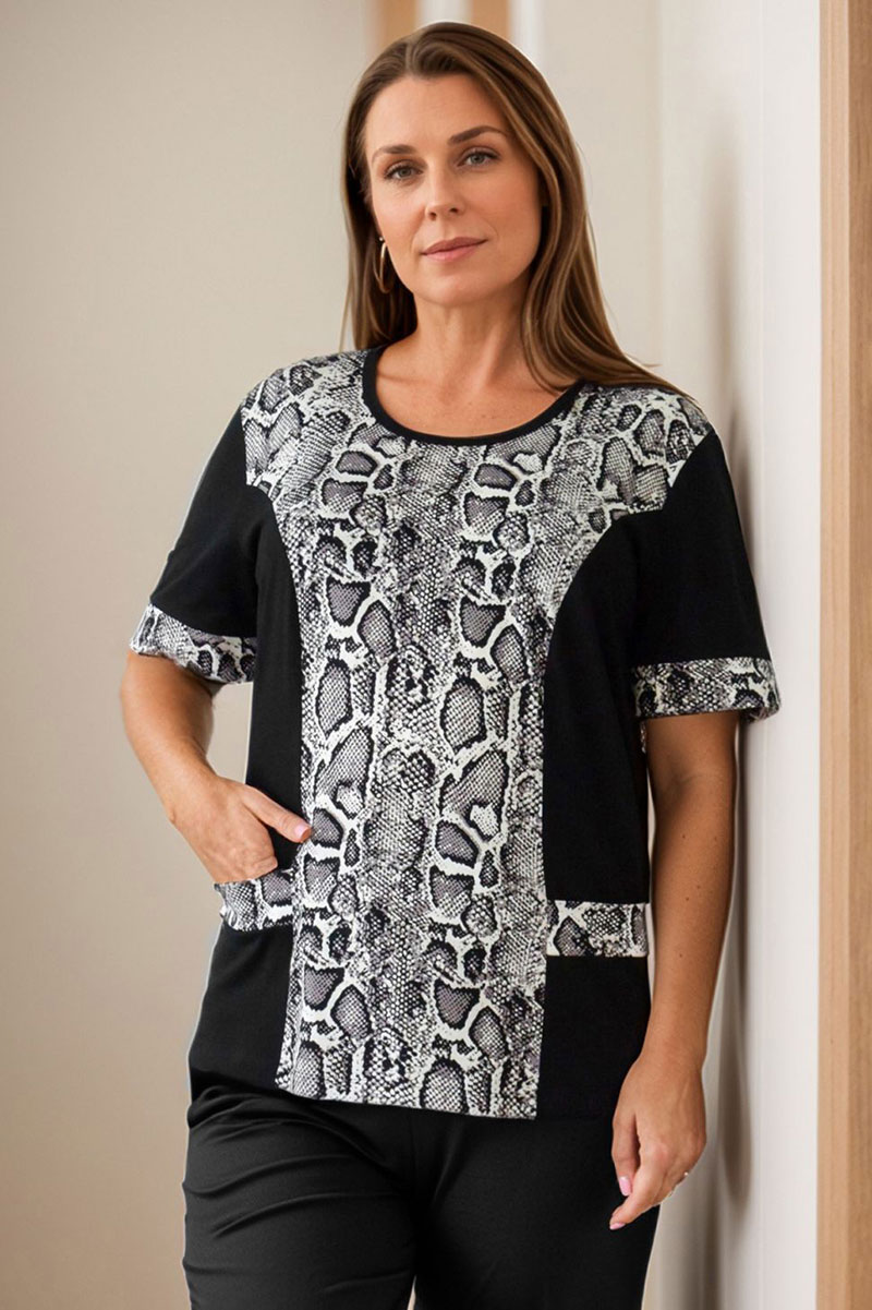 Представляем Вашему вниманию трикотажную женскую футболку с карманами и декоративными вставками с набивным рисунком. Футболка с рельефными швами, которые создают стройный силуэт Вашей фигуры, но в то же время обеспечивают максимум комфорта в применении.