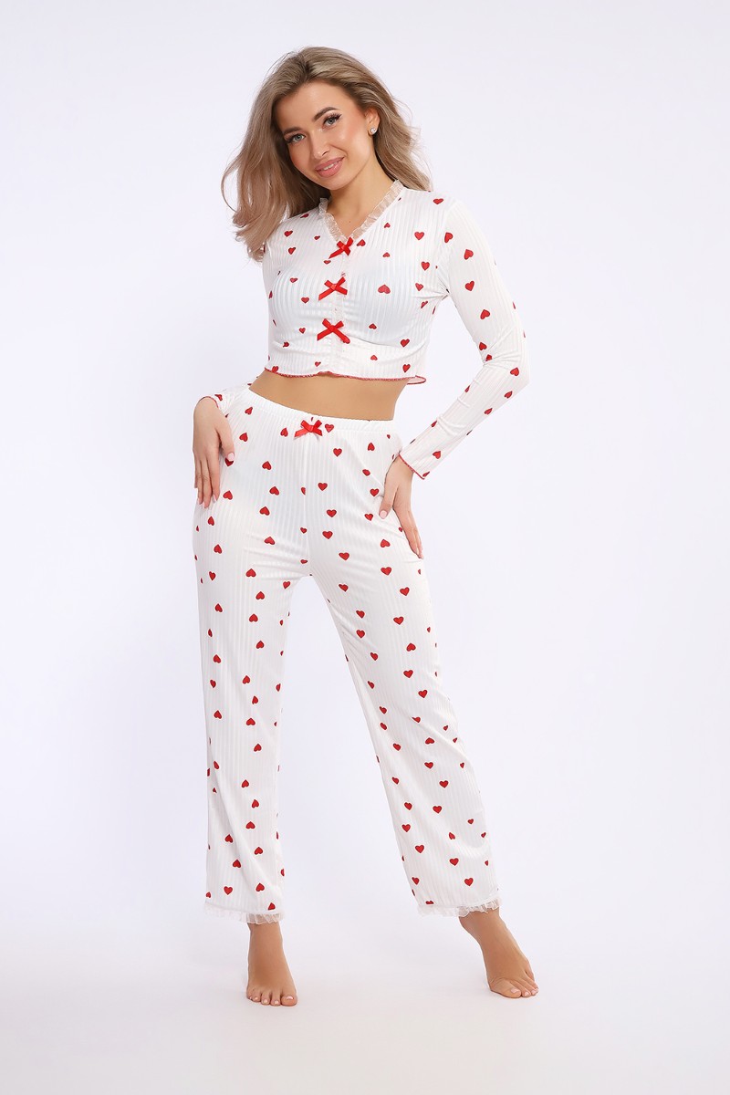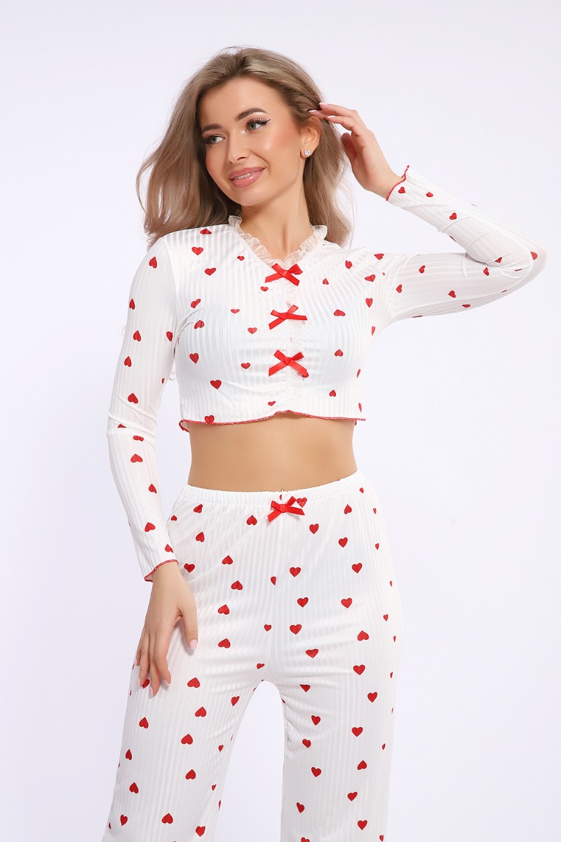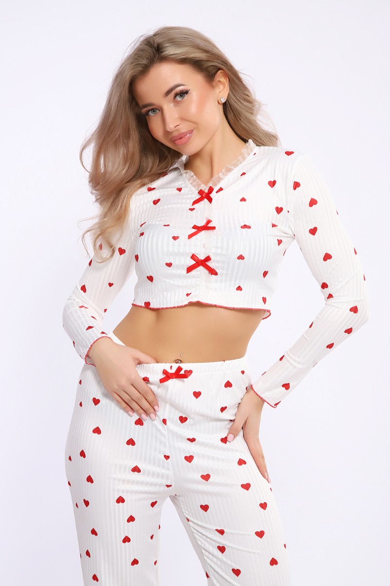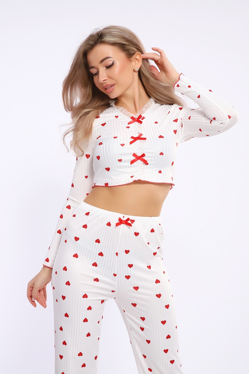 Белый цвет пижамы с красными сердечками придаст вам очарование и станет вашим любимым нарядом. Комплект состоит из штанов с эластичной резинкой на талии и рубашки с длинным рукавом, что создает образ домашней красотки. А изящные бантики из тесьмы добавят изысканности вашему образу.