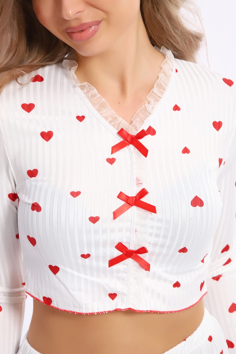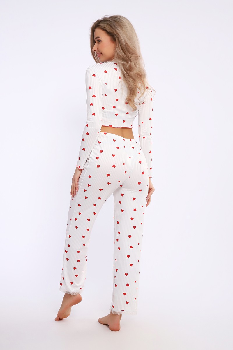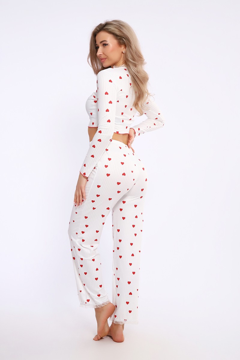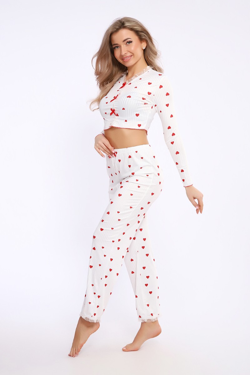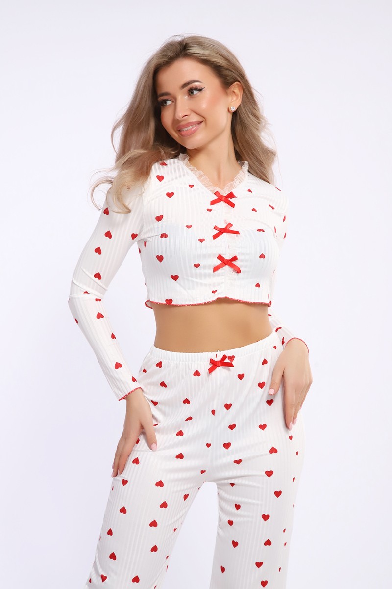 Белый цвет пижамы с красными сердечками придаст вам очарование и станет вашим любимым нарядом. Комплект состоит из штанов с эластичной резинкой на талии и рубашки с длинным рукавом, что создает образ домашней красотки. А изящные бантики из тесьмы добавят изысканности вашему образу.
