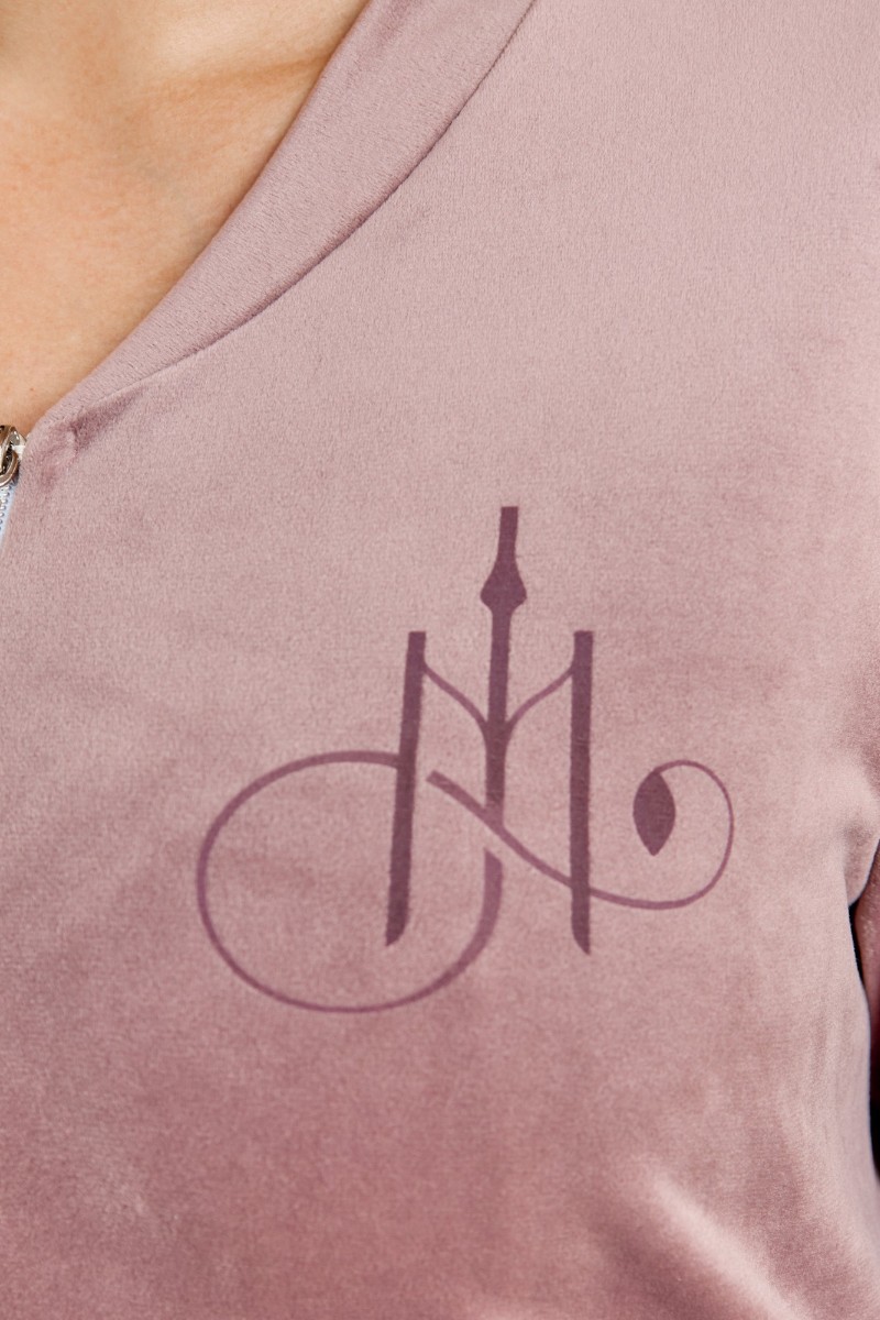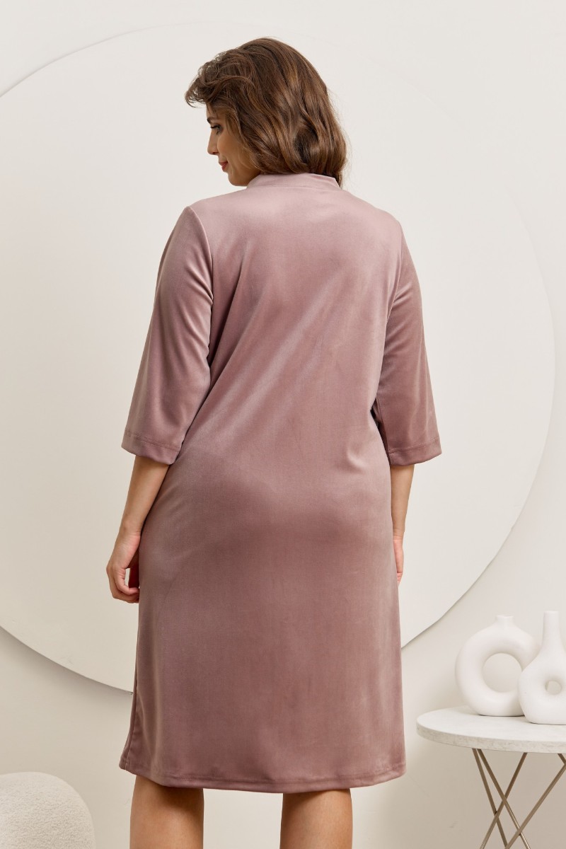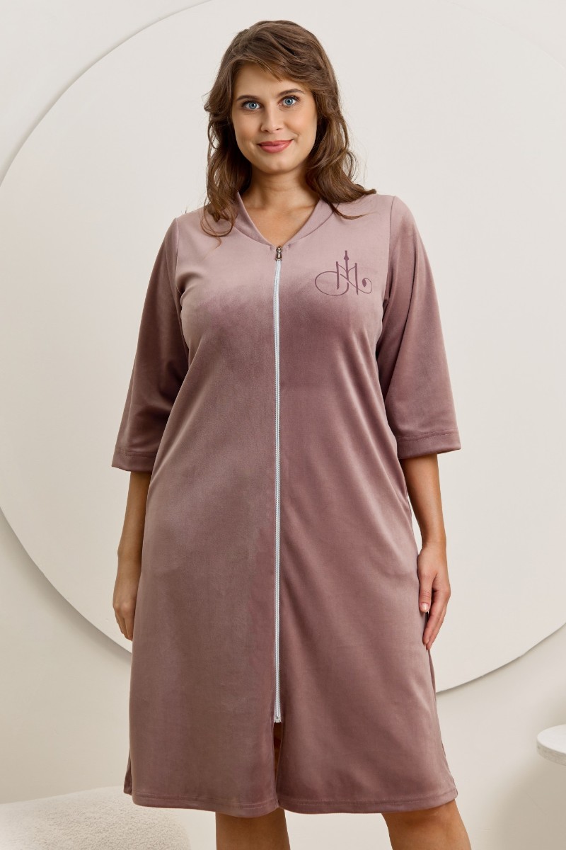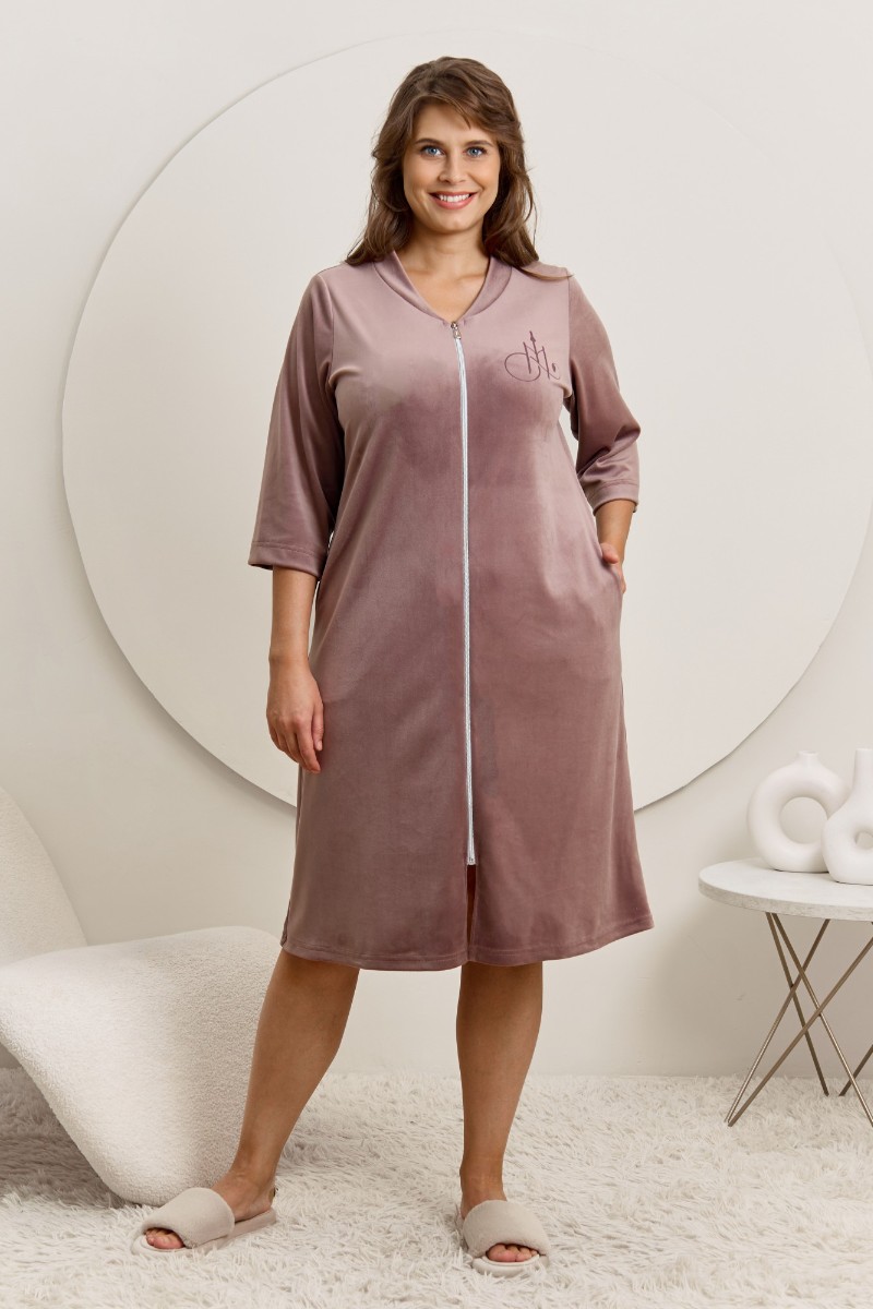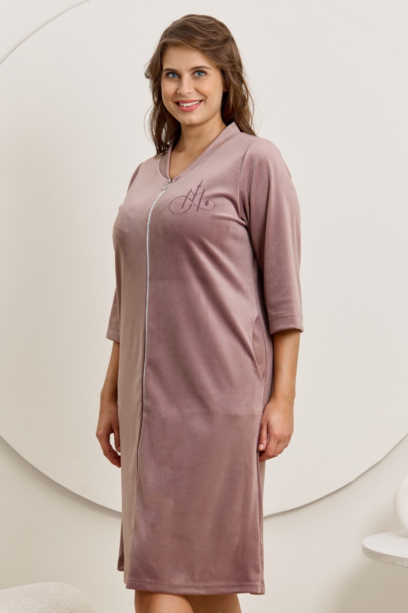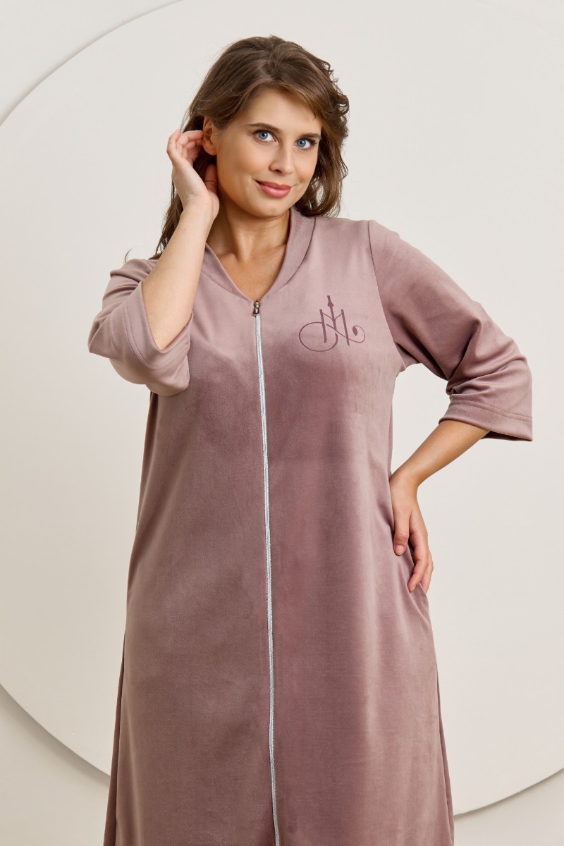 Представляем Вашему вниманию халат женский из гладкокрашенного трикотажного полотна «велюр стрейч», прямого силуэта, с втачными рукавами длиной ¾ и карманами в боковых швах. Горловина v-образной формы обработана втачной планкой, переходящей в центральную бортовую застежку на тесьму «молния», на левой полочке печать, выполненная в технике «шелкографии».