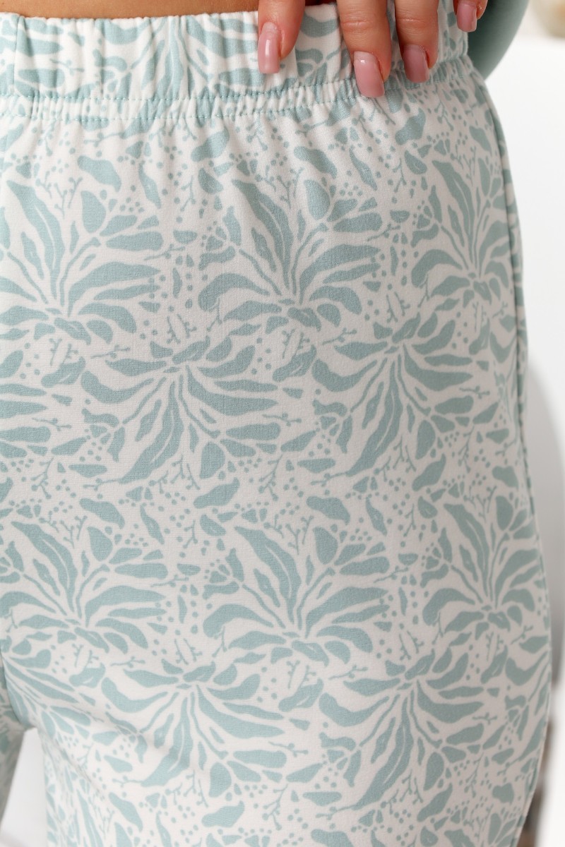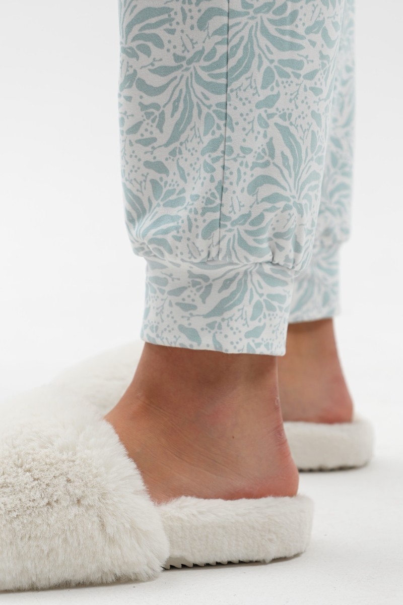 Представляем Вашему вниманию женскую пижаму из трикотажного полотна «микрофлис» в комбинации двух видов: с набивным рисунком и гладкокрашеного в единой цветовой гамме, состоящая из футболки и брюк. Футболка - из гладкокрашенного полотна, классического покроя, с длинными втачными рукавами, горловиной овальной формы, окантованной основным материалом.Брюки – из полотна с набивным рисунком, свободного покроя, с эластичной тесьмой по талии и притачными манжетами по нижним срезам.