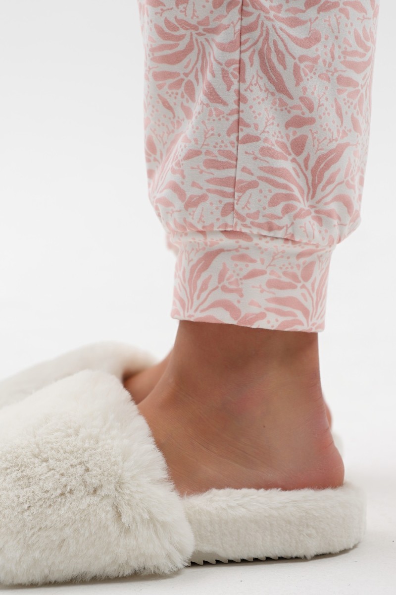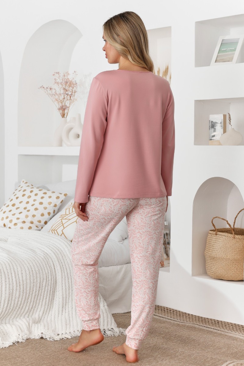 Представляем Вашему вниманию женскую пижаму из трикотажного полотна «микрофлис» в комбинации двух видов: с набивным рисунком и гладкокрашеного в единой цветовой гамме, состоящая из футболки и брюк. Футболка - из гладкокрашенного полотна, классического покроя, с длинными втачными рукавами, горловиной овальной формы, окантованной основным материалом.Брюки – из полотна с набивным рисунком, свободного покроя, с эластичной тесьмой по талии и притачными манжетами по нижним срезам.