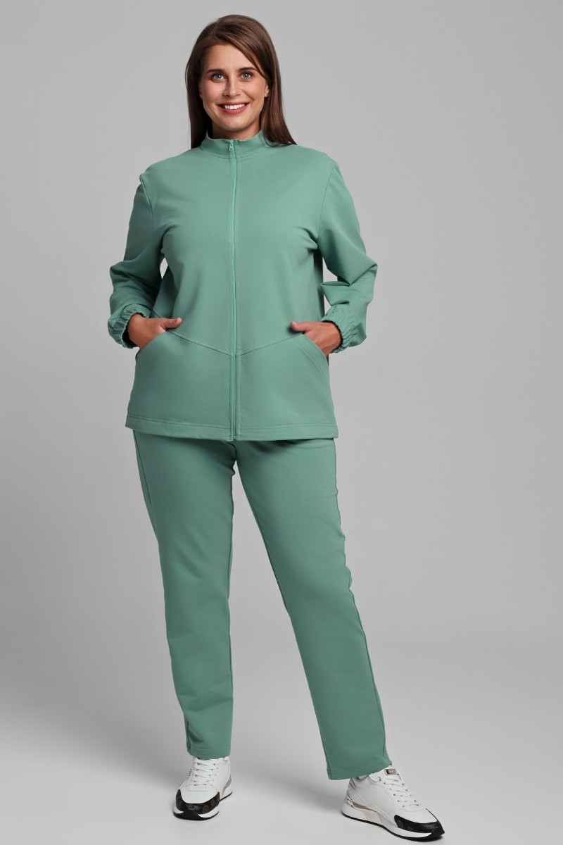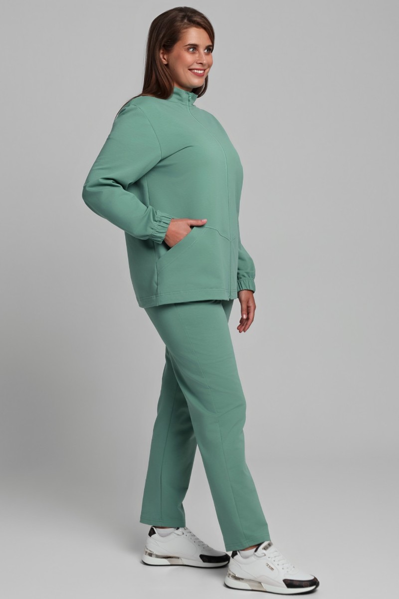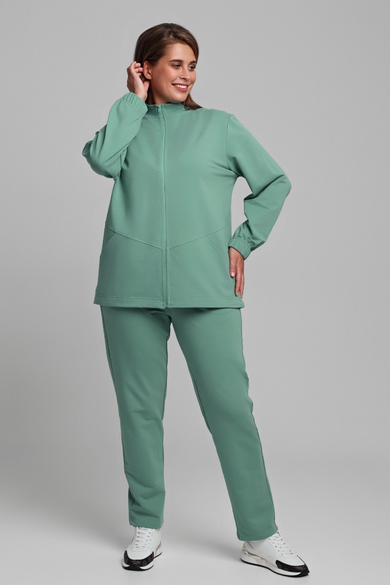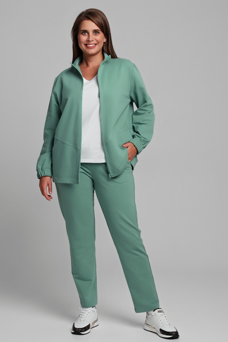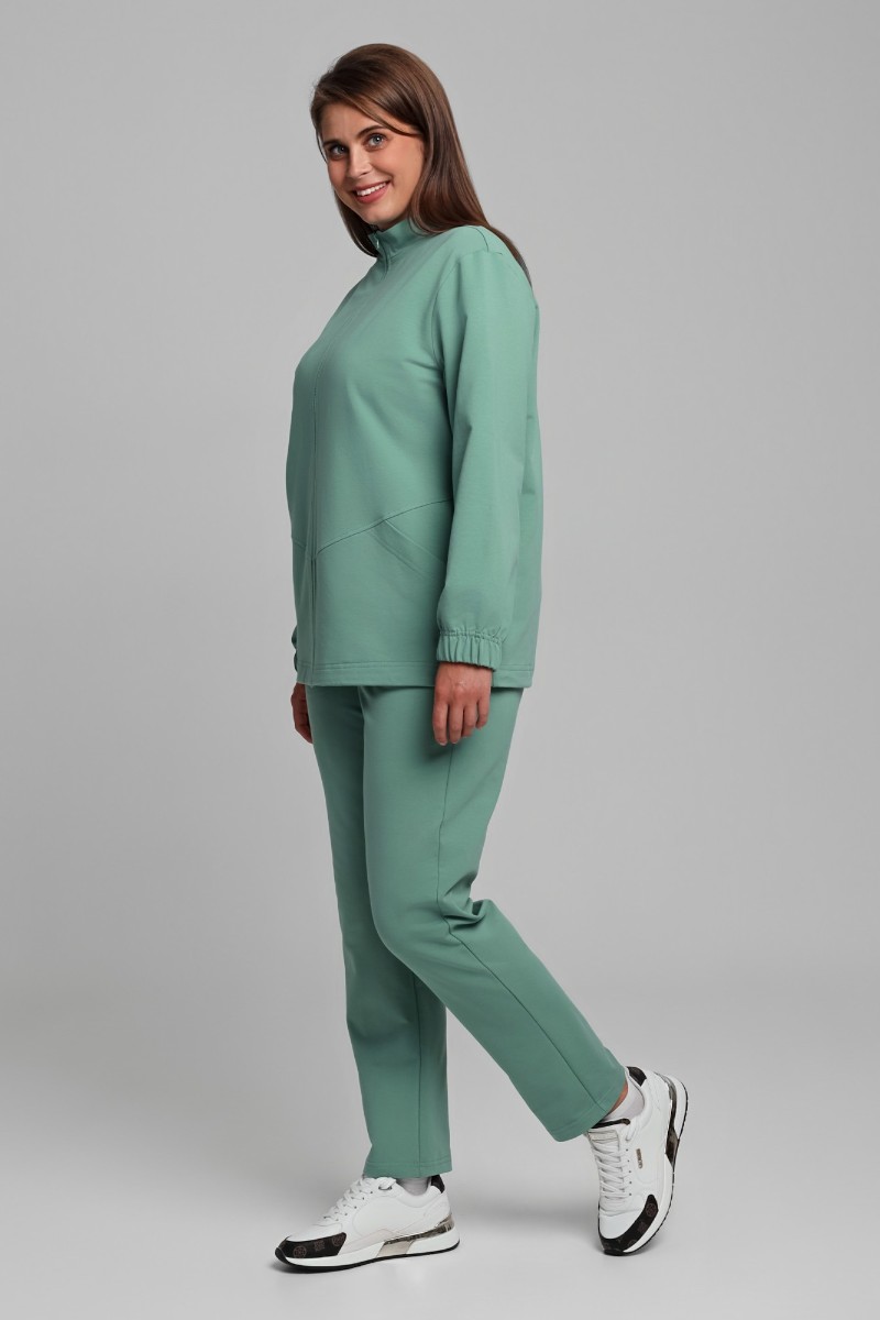 Представляем Вашему вниманию костюм женский из трикотажного полотна «футер-двунитка» в единой цветовой гамме, состоящий из куртки и брюк. Куртка - прямого силуэта, свободная с длинными втачными рукавами, воротником «стойкой». Полочка состоит из двух частей соединенных по-косой, с накладными карманами и центральной бортовой застежкой на тесьму «молния». Низ рукавов обработан эластичной тесьмой, низ изделия с подгибкой с вложение эластичной тесьмы и регулируется по длине с помощью фиксаторов.Брюки - длинные, классического покроя, на притачном поясе с эластичной тесьмой внутри и карманами в боковых шва, на задних половинах обработаны две вытачки в области линии талии.