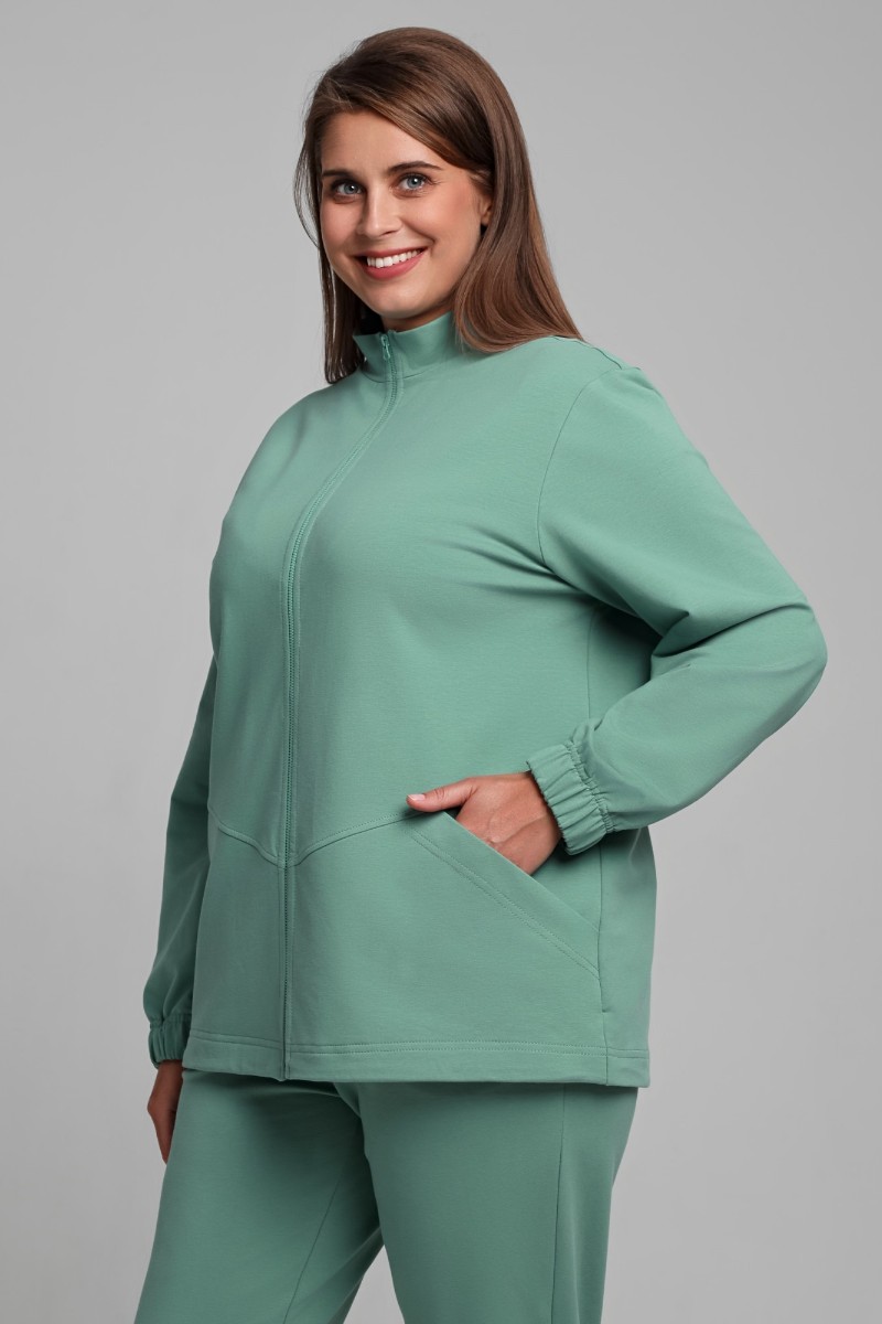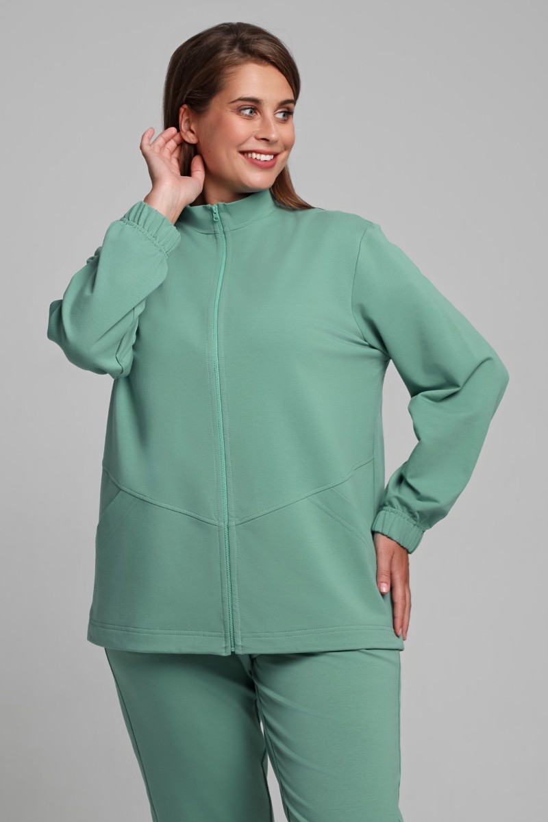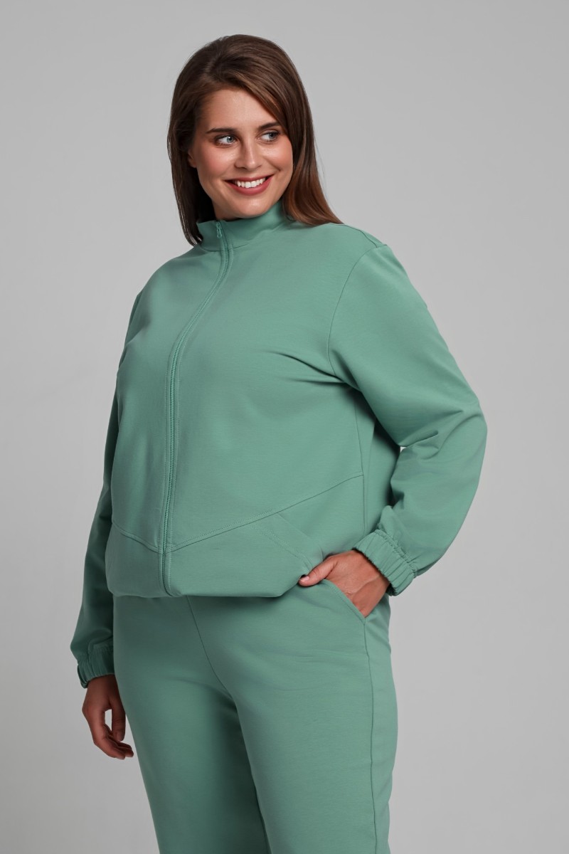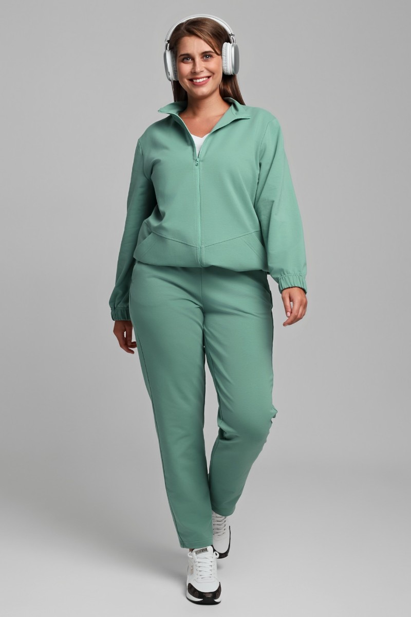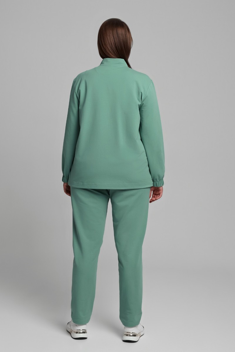 Представляем Вашему вниманию костюм женский из трикотажного полотна «футер-двунитка» в единой цветовой гамме, состоящий из куртки и брюк. Куртка - прямого силуэта, свободная с длинными втачными рукавами, воротником «стойкой». Полочка состоит из двух частей соединенных по-косой, с накладными карманами и центральной бортовой застежкой на тесьму «молния». Низ рукавов обработан эластичной тесьмой, низ изделия с подгибкой с вложение эластичной тесьмы и регулируется по длине с помощью фиксаторов.Брюки - длинные, классического покроя, на притачном поясе с эластичной тесьмой внутри и карманами в боковых шва, на задних половинах обработаны две вытачки в области линии талии.