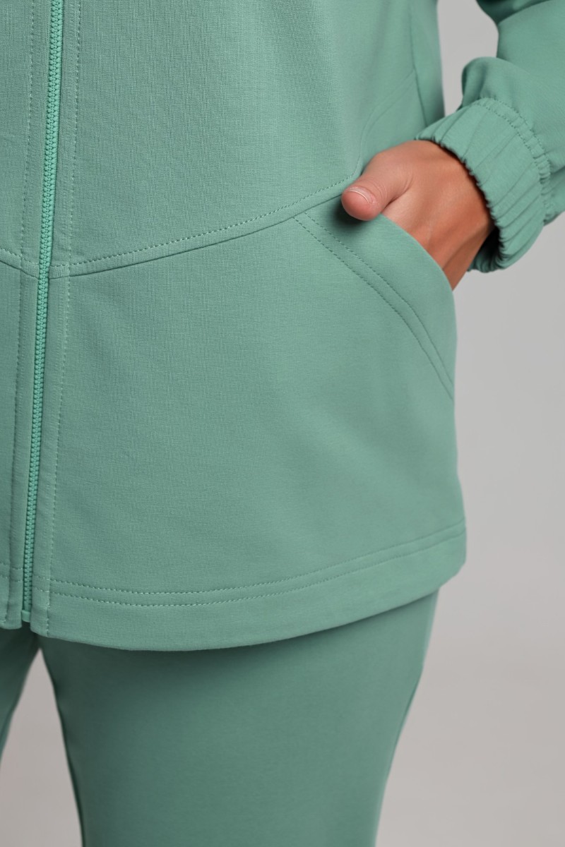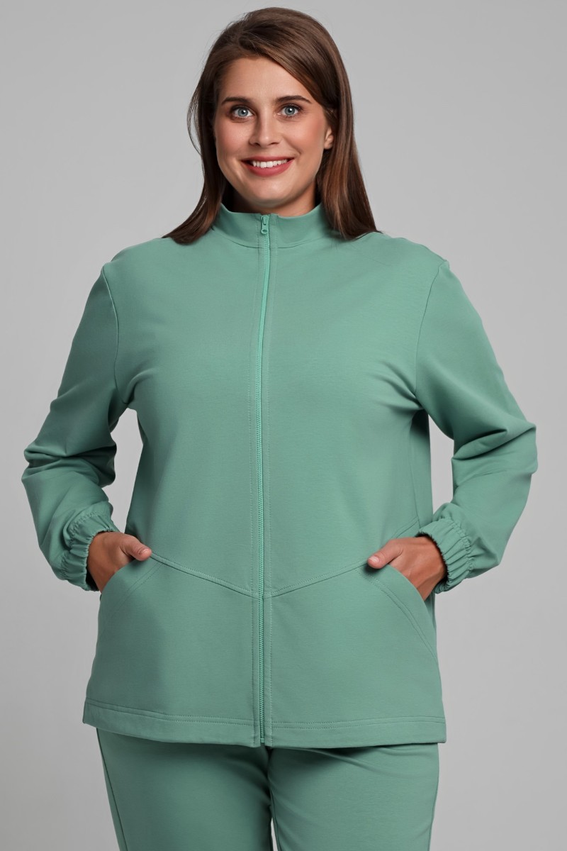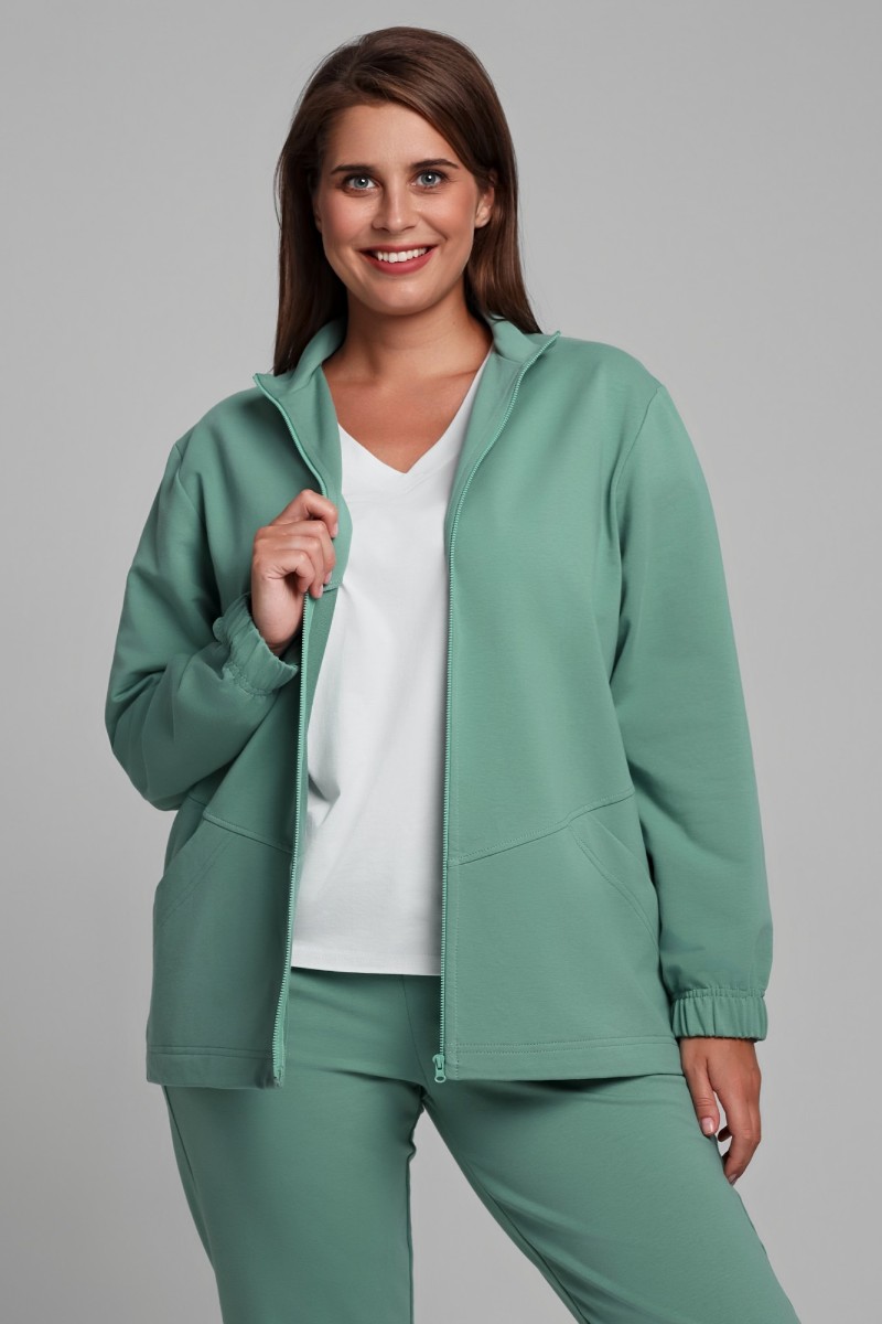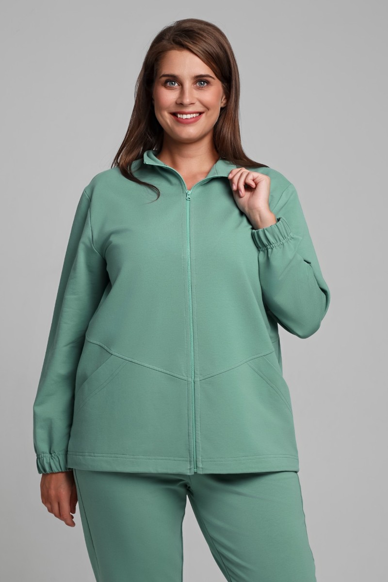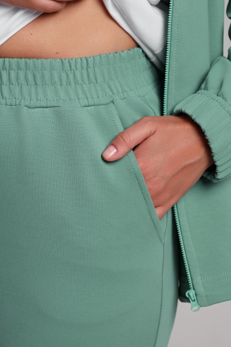 Представляем Вашему вниманию костюм женский из трикотажного полотна «футер-двунитка» в единой цветовой гамме, состоящий из куртки и брюк. Куртка - прямого силуэта, свободная с длинными втачными рукавами, воротником «стойкой». Полочка состоит из двух частей соединенных по-косой, с накладными карманами и центральной бортовой застежкой на тесьму «молния». Низ рукавов обработан эластичной тесьмой, низ изделия с подгибкой с вложение эластичной тесьмы и регулируется по длине с помощью фиксаторов.Брюки - длинные, классического покроя, на притачном поясе с эластичной тесьмой внутри и карманами в боковых шва, на задних половинах обработаны две вытачки в области линии талии.