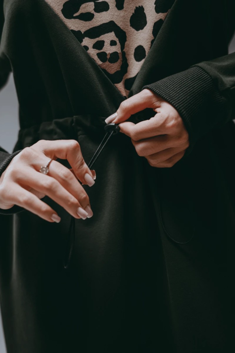 Представляем Вашему вниманию платье, прямого силуэта длины миди с длинным рукавом. Платье отрезное по линии талии с кулиской из припуска, в которую вставлен шнур (шляпная резинка), ограниченный фиксаторами.