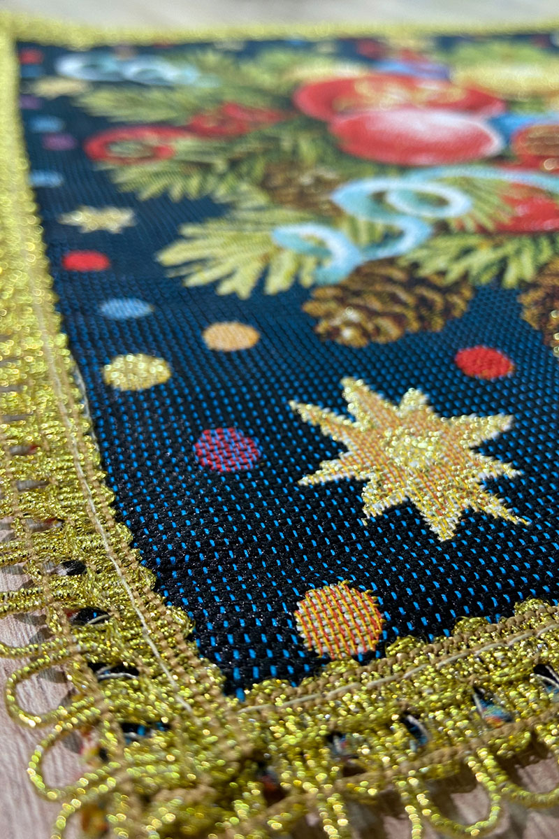 Гобелен выполнен с использованием золотой нити (люрекса), которая придаёт изделию блеск и богатый вид. По краю салфетка обработана красивой декоративной тесьмой.