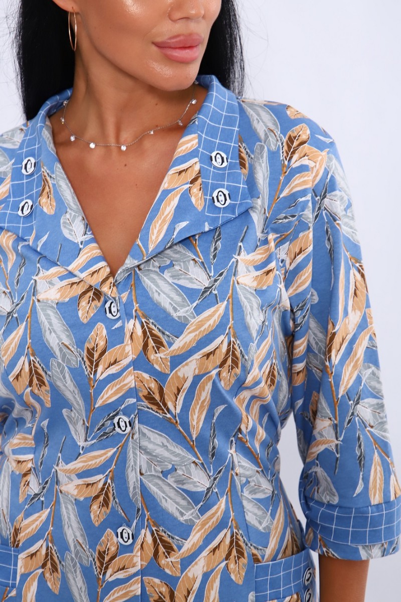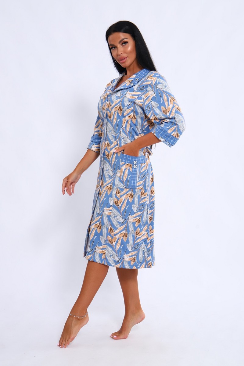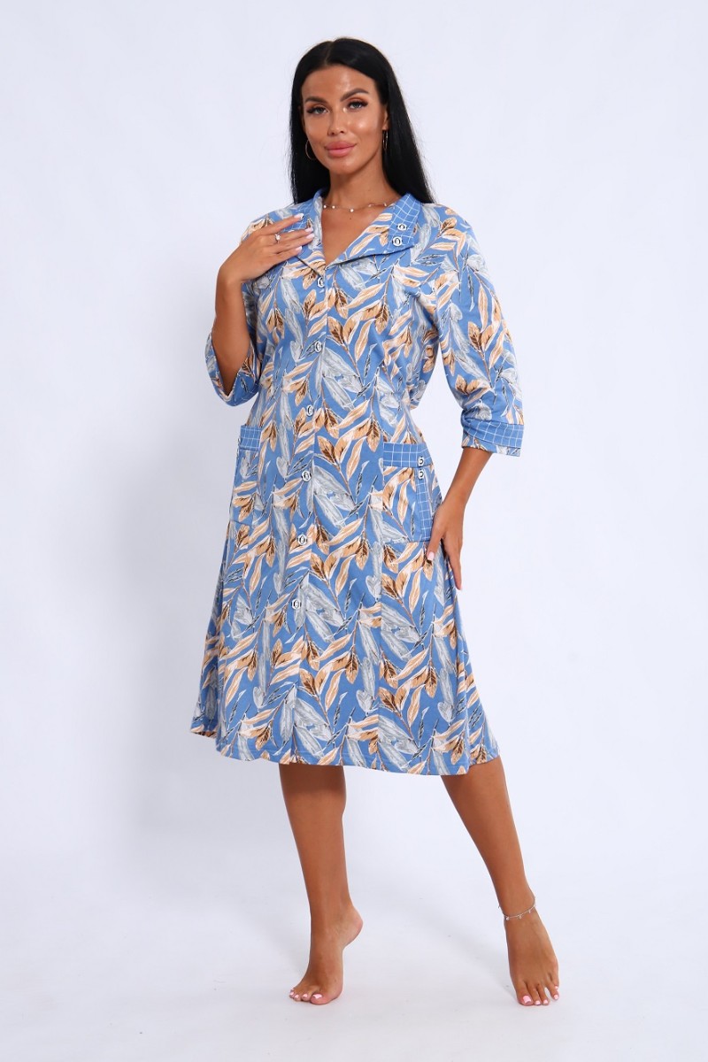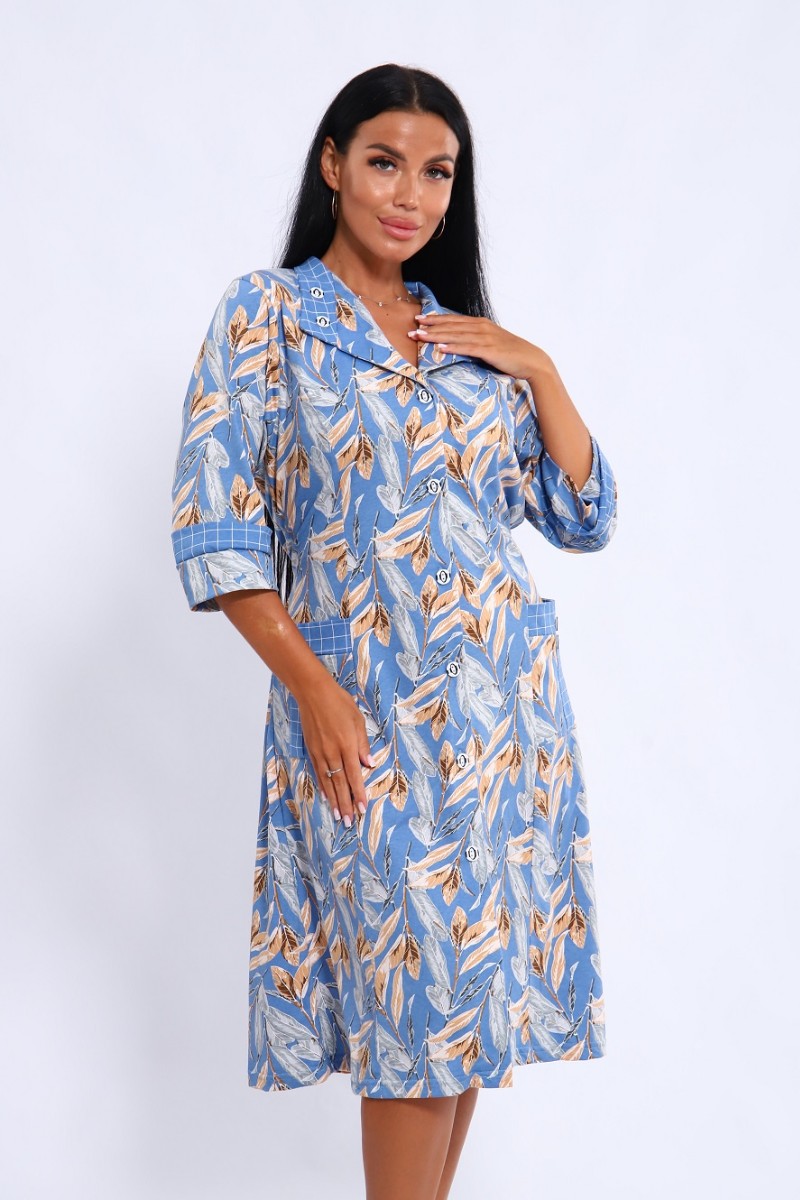 Халат женский 561 кулирка (последний размер) голубой-белый-листья 52-54