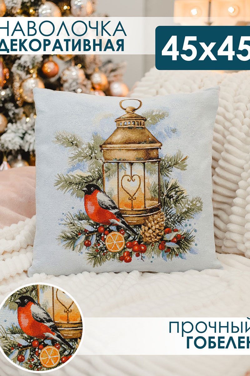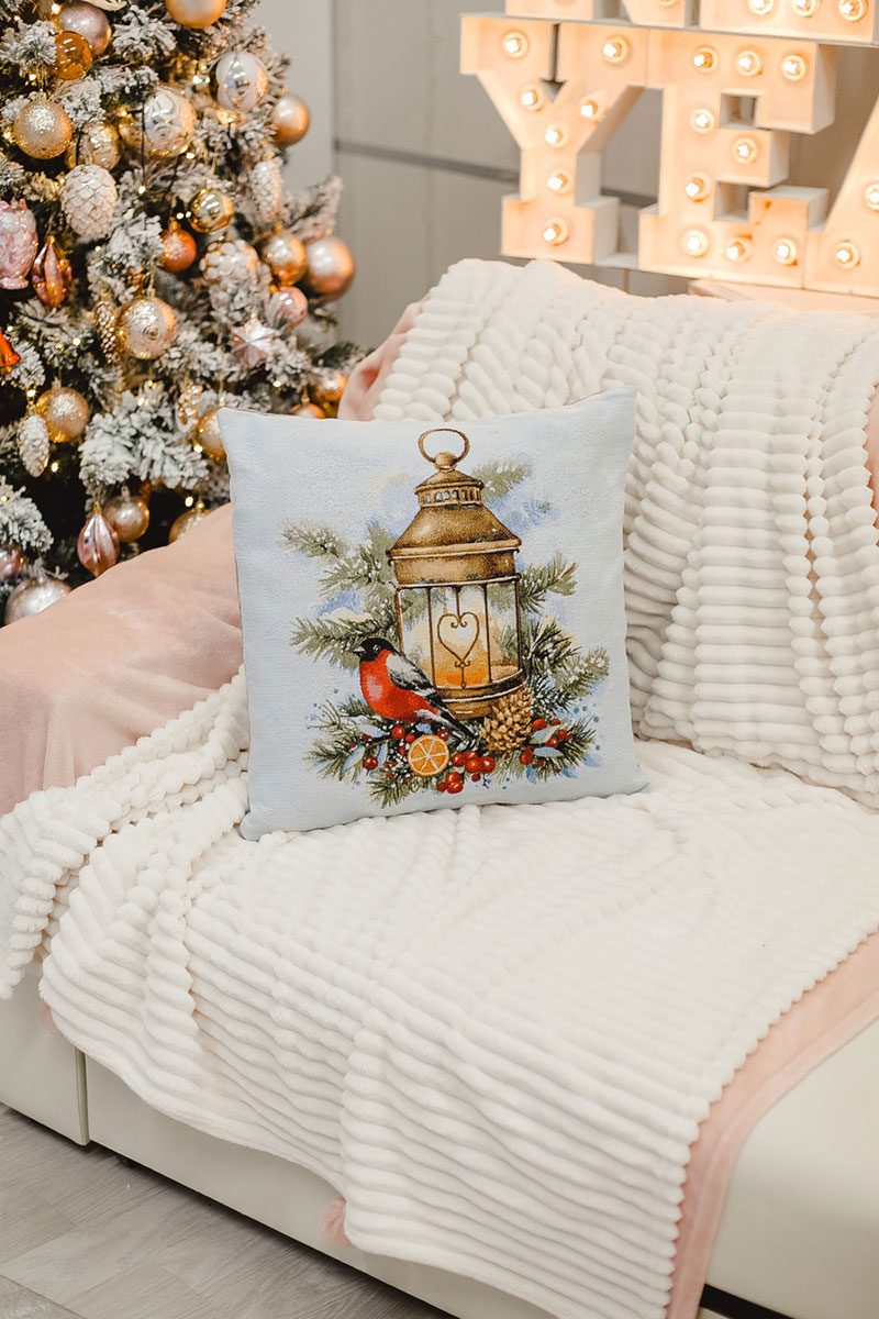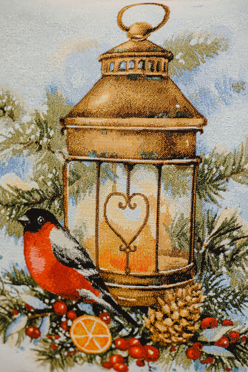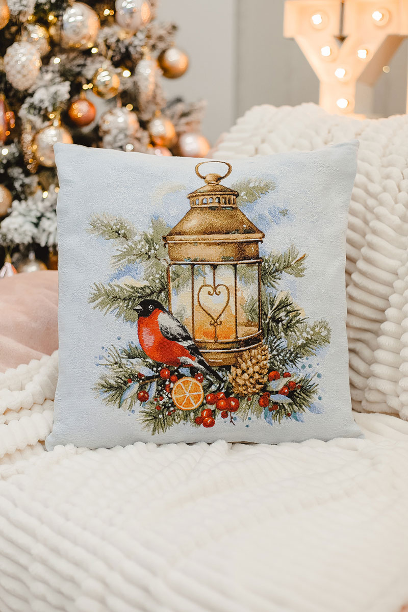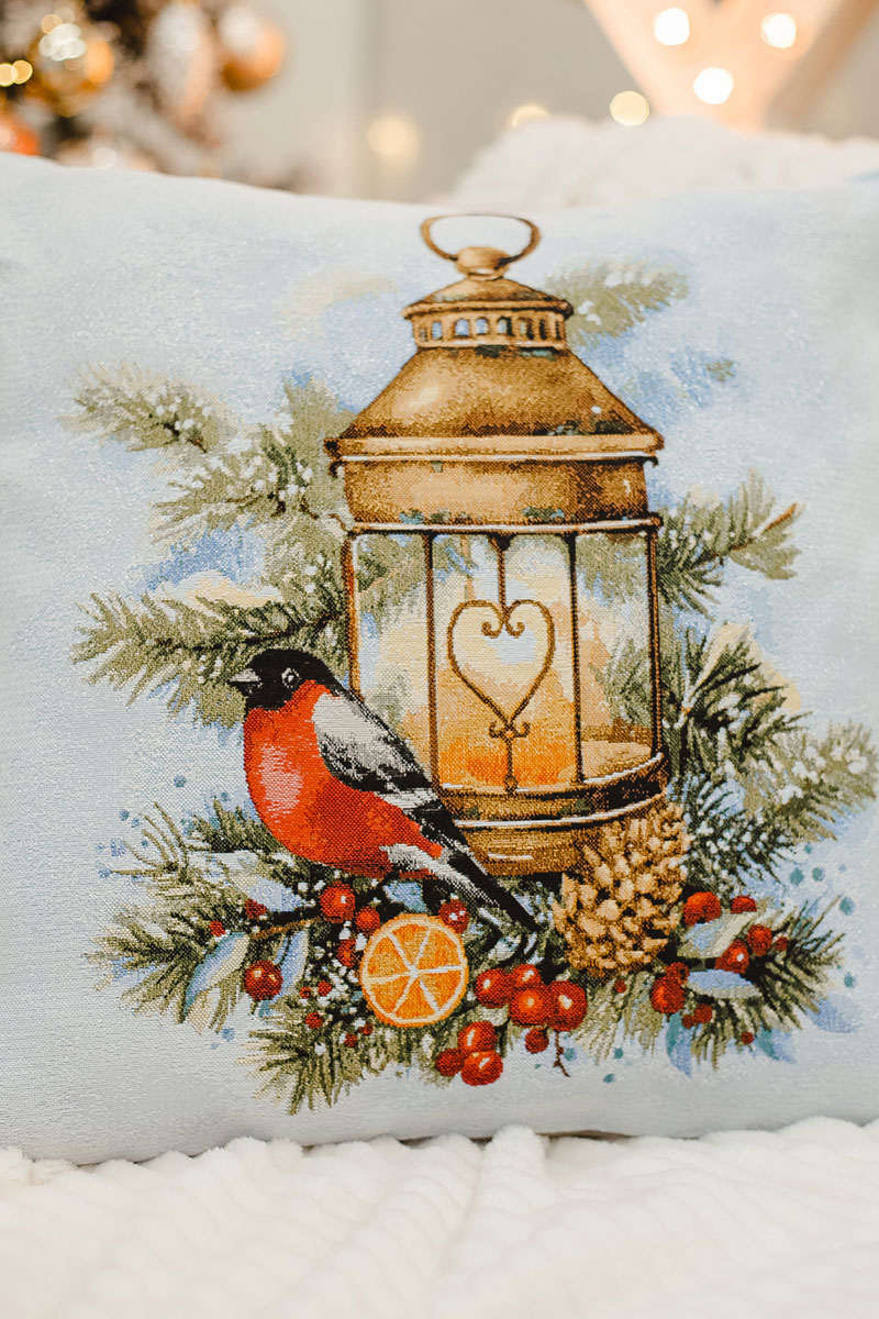 Наволочка-чехол декоративная на молнии гобелен "Снегирь с фонарем" голубой