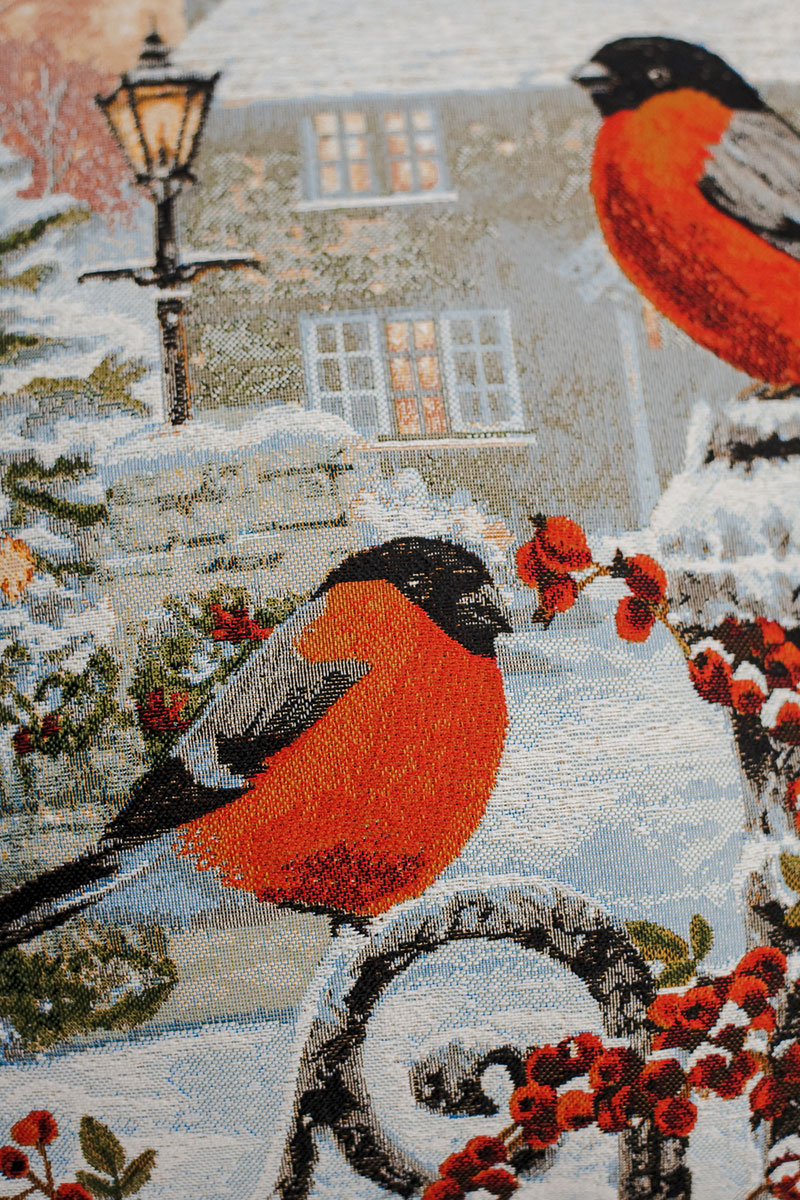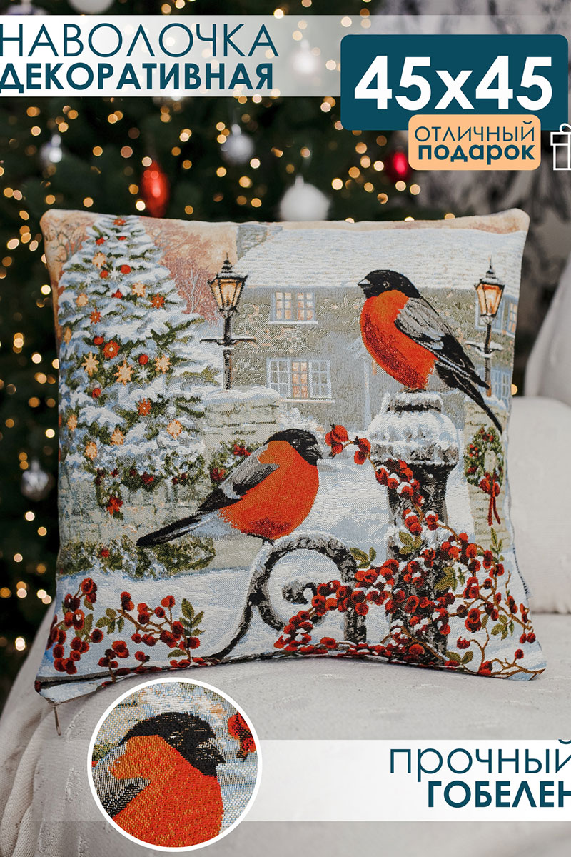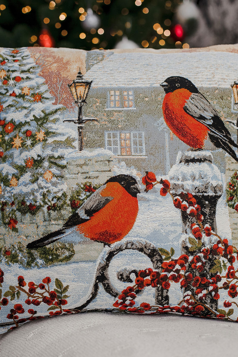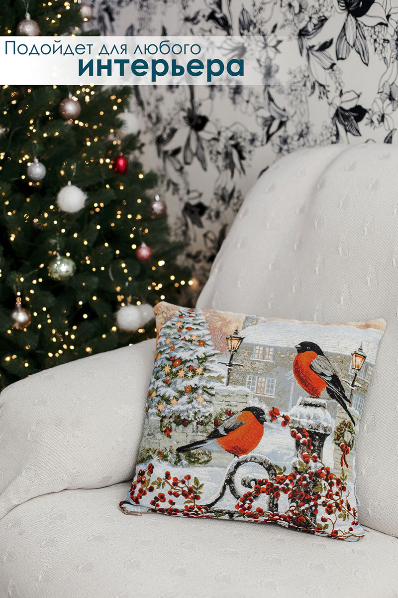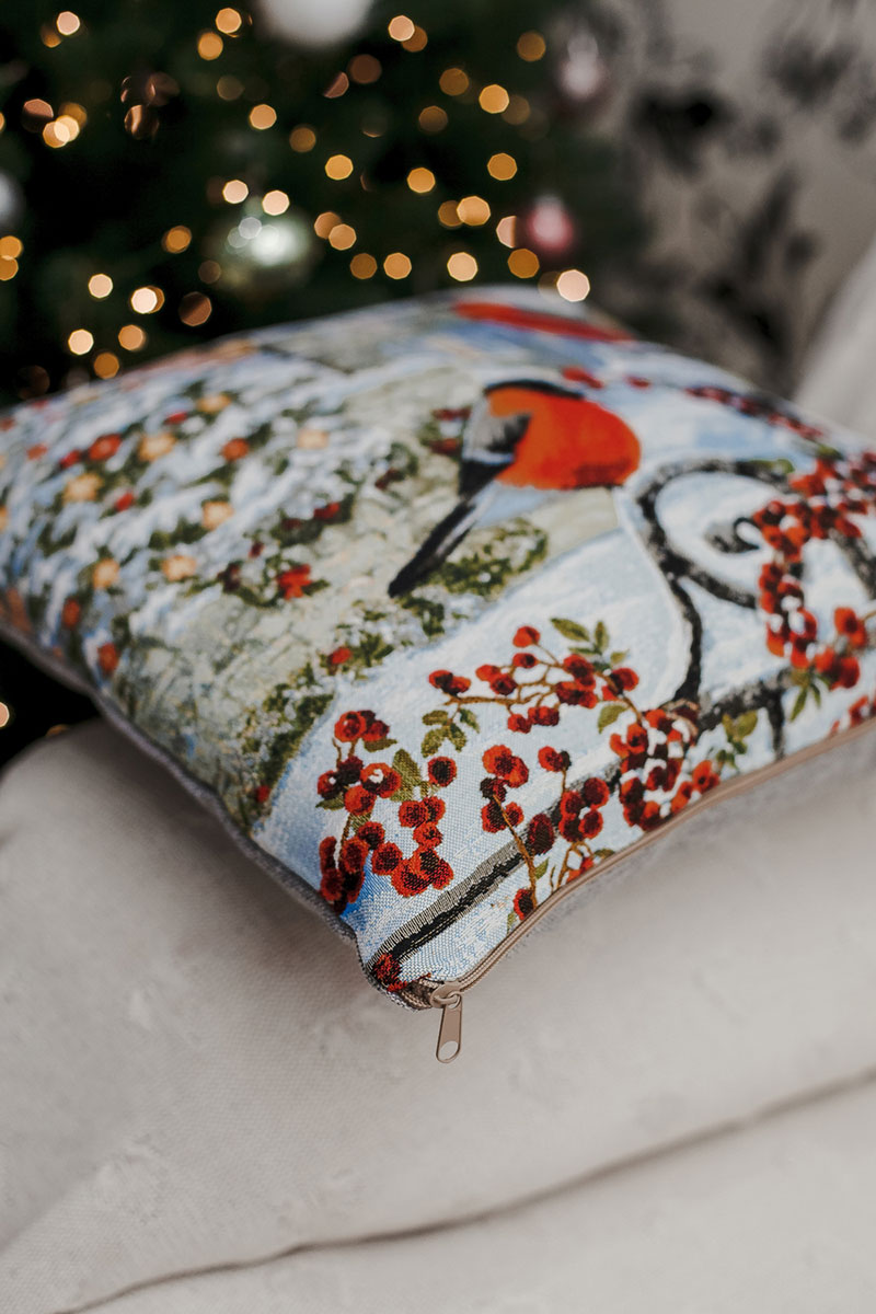 Наволочка-чехол декоративная на молнии гобелен "Снегирь с фонарем" красный