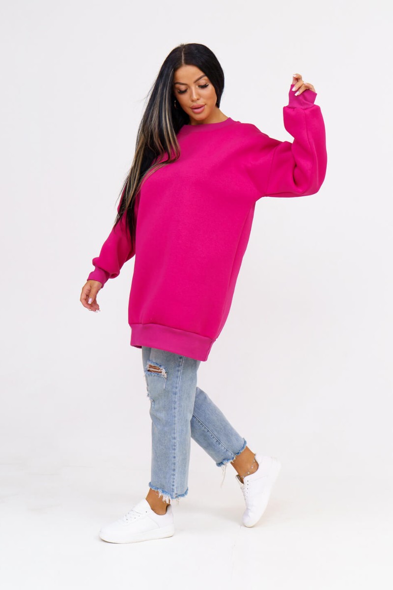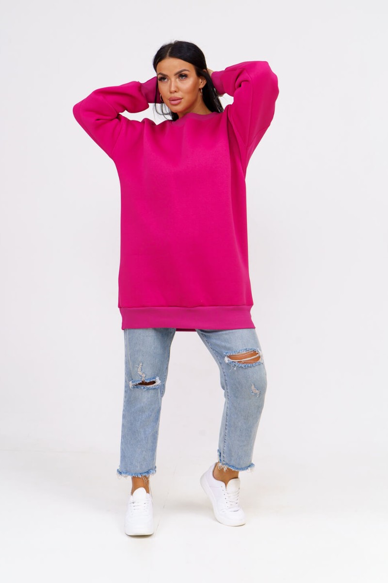Представляем Вашему вниманию женскую толстовку оверсайз, выполненную из качественного хлопкового трикотажа с начесом (футер 3-х нитка с начесом), который не деформируется при стирке и во время носки, благодаря этому материалу однотонный свитшот утепленный будет радовать вас своим видом и дарить приятные тактильные ощущения не один сезон. Стильная базовая толстовка подчеркнет достоинства фигуры. Теплая и уютная вещь в спортивном стиле заменит вам худи с начесом из флиса и школьную кофту, пуловер и толстовку с капюшоном, свитер и джемпер. Удлиненная толстовка свободного кроя деликатно скроет несовершенства полной фигуры. Объемная модель с длинным рукавом на манжете и округлым вырезом горловины удобна в повседневной носке: она не сковывает телодвижения, отлично комбинируется с одеждой разных стилей и фасонов, цветов и фактур.
