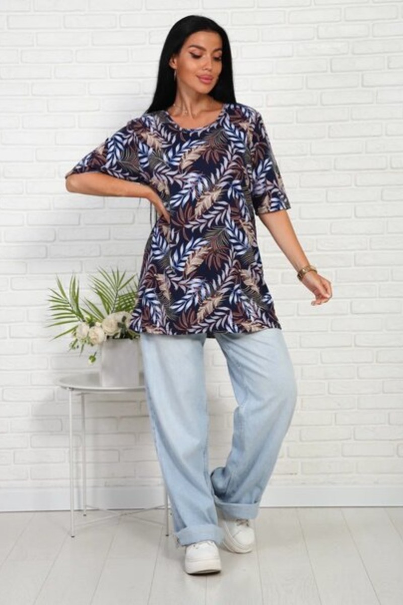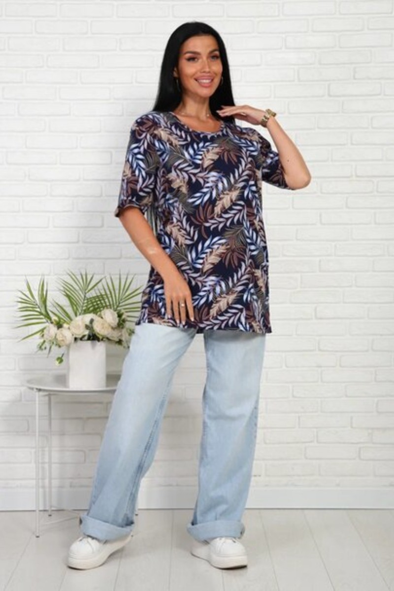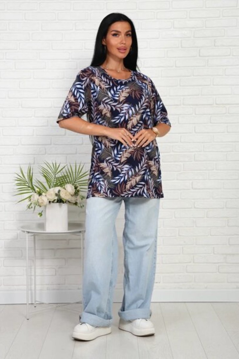 Футболка женская №700 кулирка (р-ры: 48-70) листья на синем