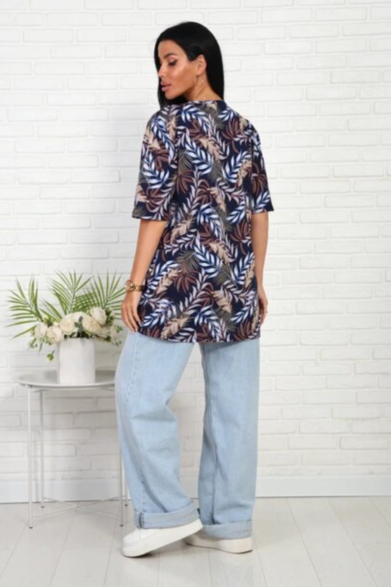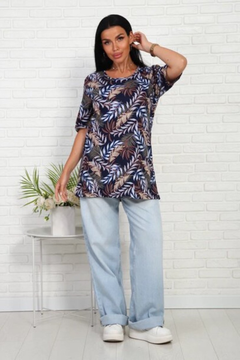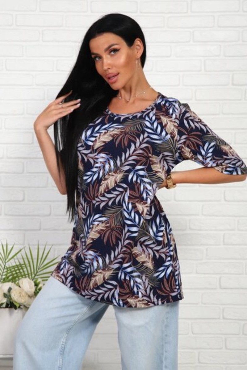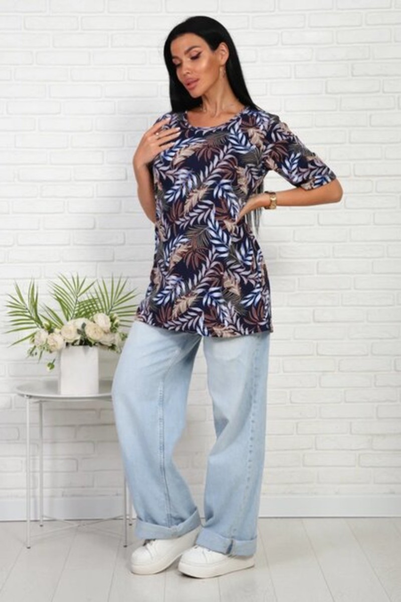 Футболка женская №700 кулирка (р-ры: 48-70) листья на синем