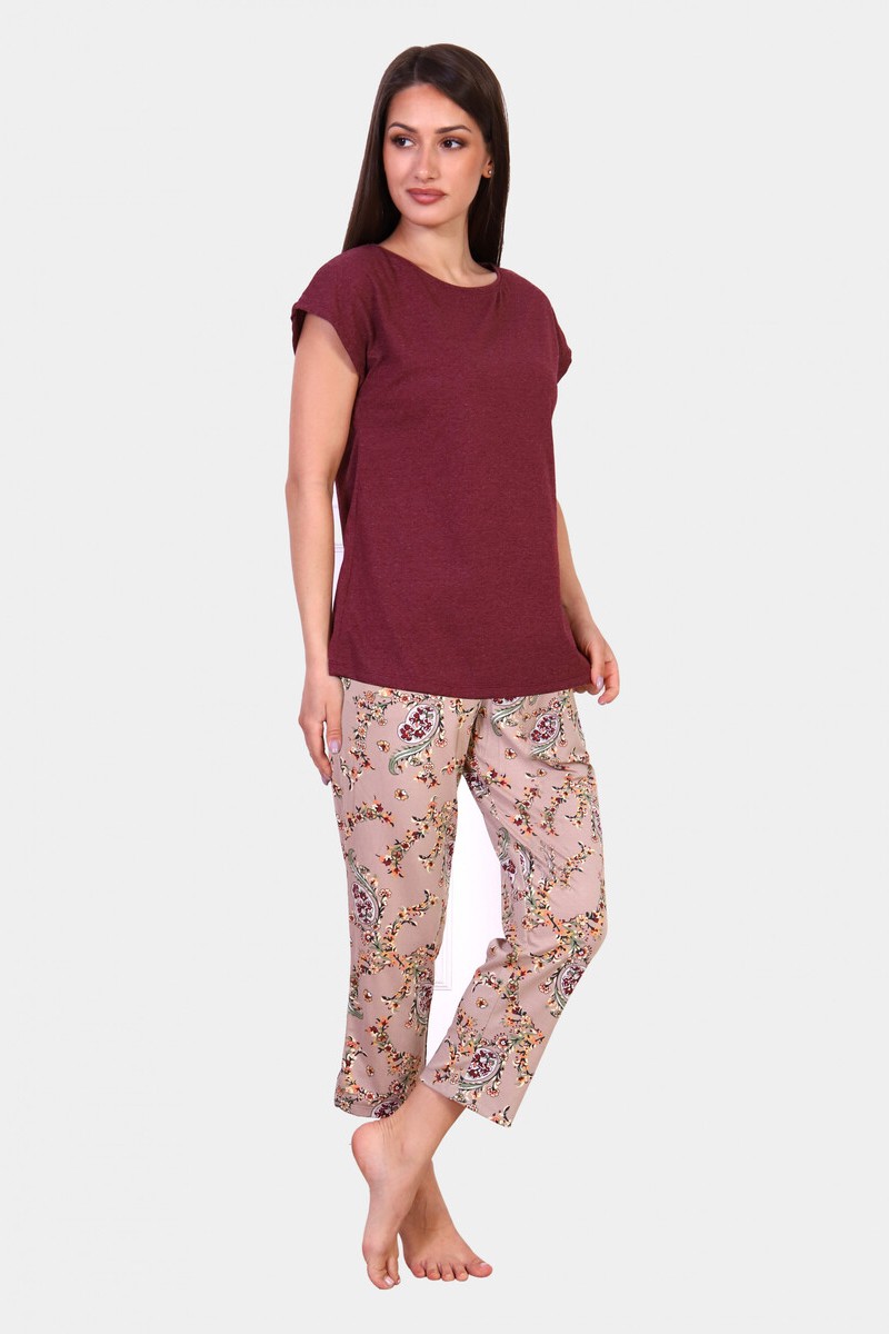 Представляем Вашему вниманию стильный и комфортный женский костюм двойку для дома, состоящий из футболки со спущенным плечом и укороченных брюк, дополненных небольшими карманами в боковых швах. Комплект выполнен из мягкого, высококачественного материала, который обеспечивает превосходную вентиляцию и приятные тактильные ощущения в повседневной носке.